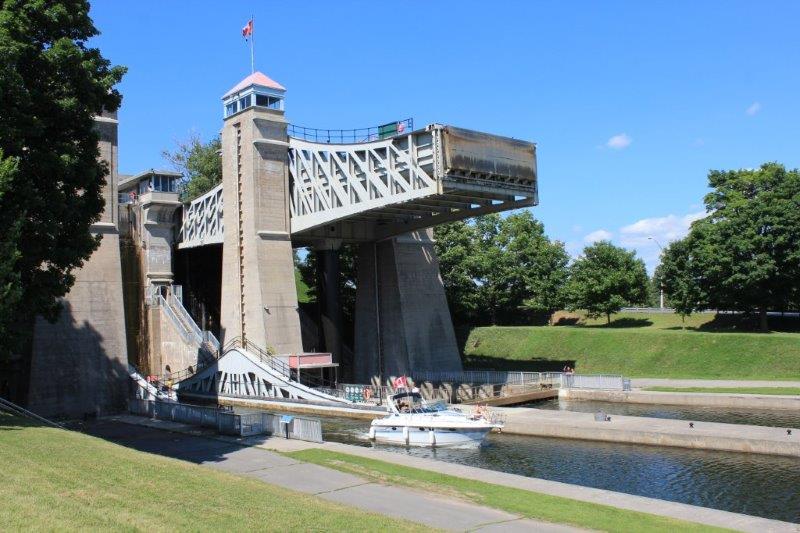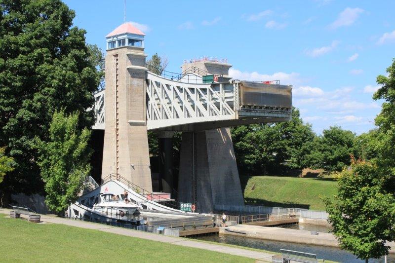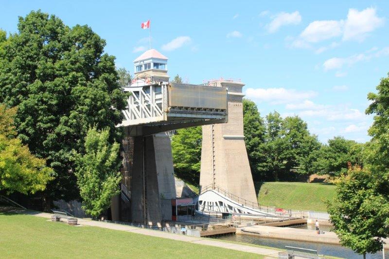 You actually drive through the lock to get to the viewing area and visitor’s center. The boats are lifted 65′ – making this the tallest lift lock in the world. There are 6 km of man made canal leading up to the lock. The Peterborough Lift Lock is part of the Trent-Severn Waterway; a 386 km long system of lakes and locks running from Lake Ontario to Georgian Bay.