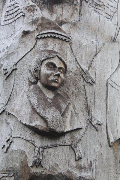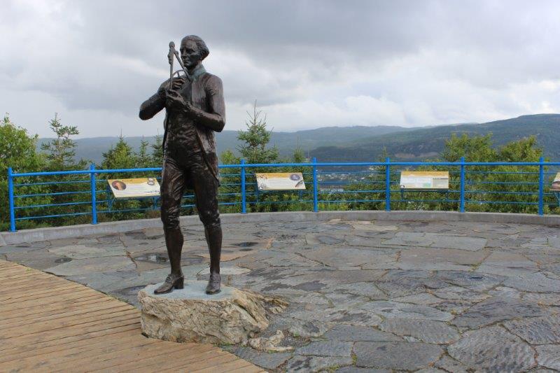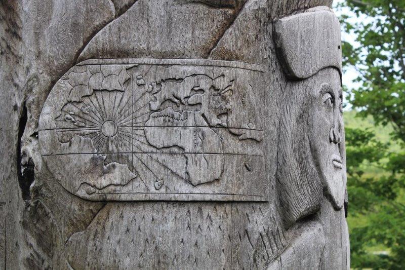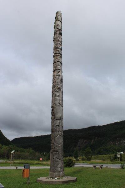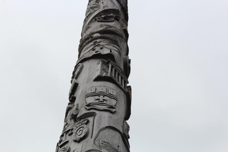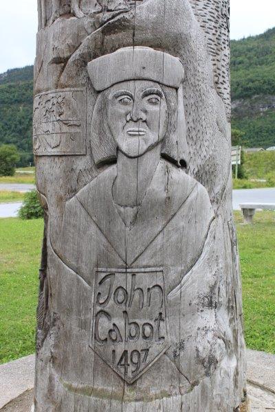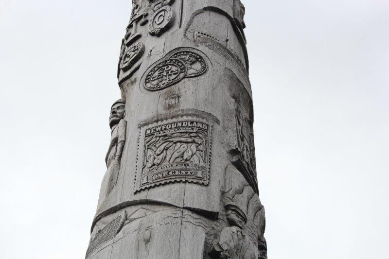 We stopped briefly at Steady Brook to see the Newfoundland Labrador Heritage Tree. It was erected in 1999 as a 50th anniversary project to commemorate Newfoundland and Labrador joining Confederation in 1949. The 50′ tall tree was cut by a Labrador man working for Western Forest Products. The forestry company donated the log and spent $15,000 having it moved to the dock side for pick up by a transport company. It was moved via various transport companies, at half the regular rate, to North Sydney, NS where Marine Atlantic had it loaded on one of their ferries and brought it to Newfoundland – without charge. They have counted 417 rings on it so it began to grow about 1583 which was when Sir Humphrey Gilbert claimed this land for England. Newfoundland became Britain’s first and oldest colony. The tree is carved with images of people and events in the Province’s history since then. Pretty cool project I’d say.
