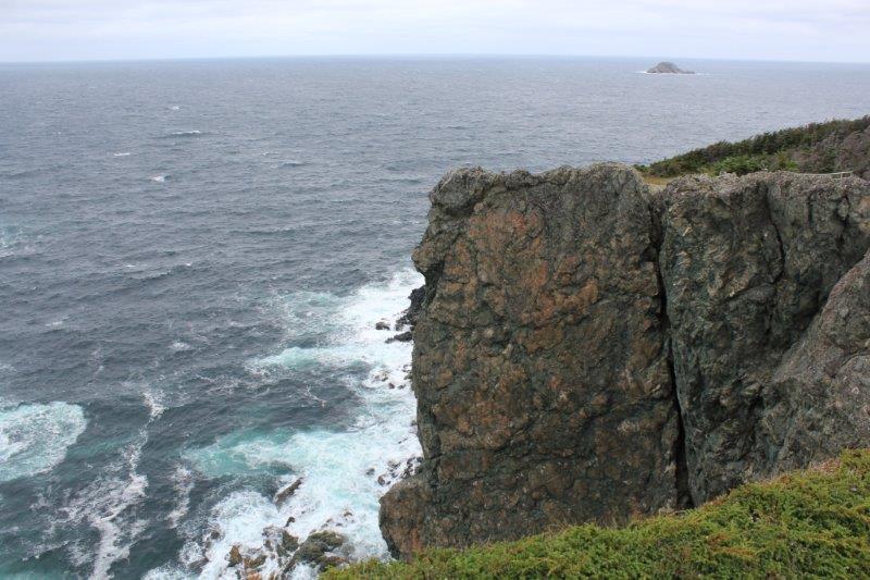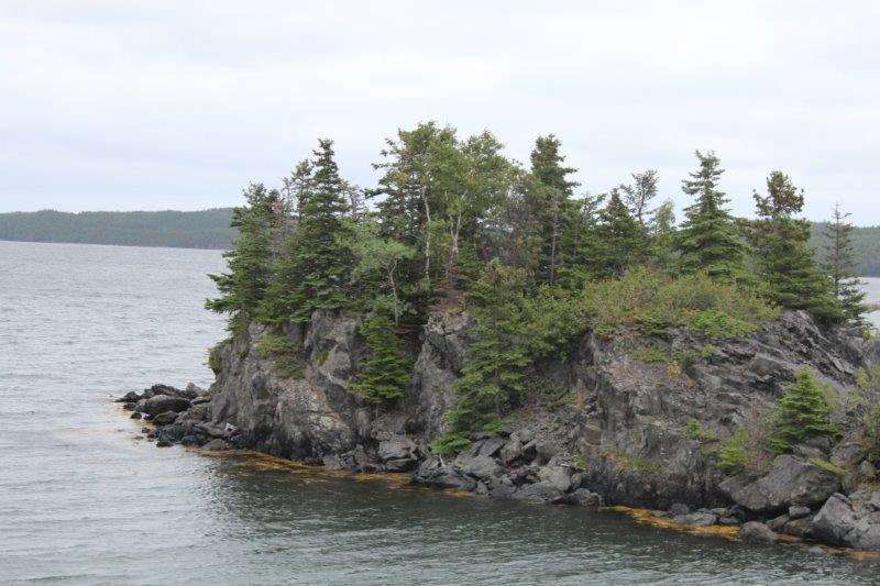 Little islands and upthrusting rocks are common all around the Newfoundland coast but the Bay of Islands has a lot of them and if the water is churning (like today) the rocks are submerged and many a boat has paid dearly when they hit one.