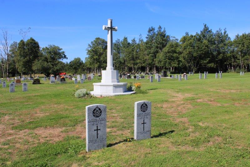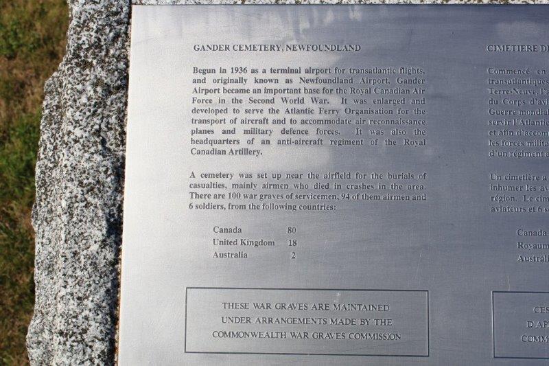 The first was the Commonwealth War Graves. Beginning in 1936 Gander became an important part of trans-Atlantic flight; the town was perfectly situated to be a refueling stop. During WWII many flights originated from here to attack the German U-Boats that were trying to destroy the supply convoys sailing out of Halifax and other Canadian ports on the way to Britain and Europe. There are 100 graves in the Commonwealth War Graves part of the cemetery up on a hill 1/4 mile from the TCHwy; 80 are for Canadians, 18 from the UK, and 2 Australians. They are the 94 servicemen and 6 soldiers that died off the coast of Newfoundland during WWII.