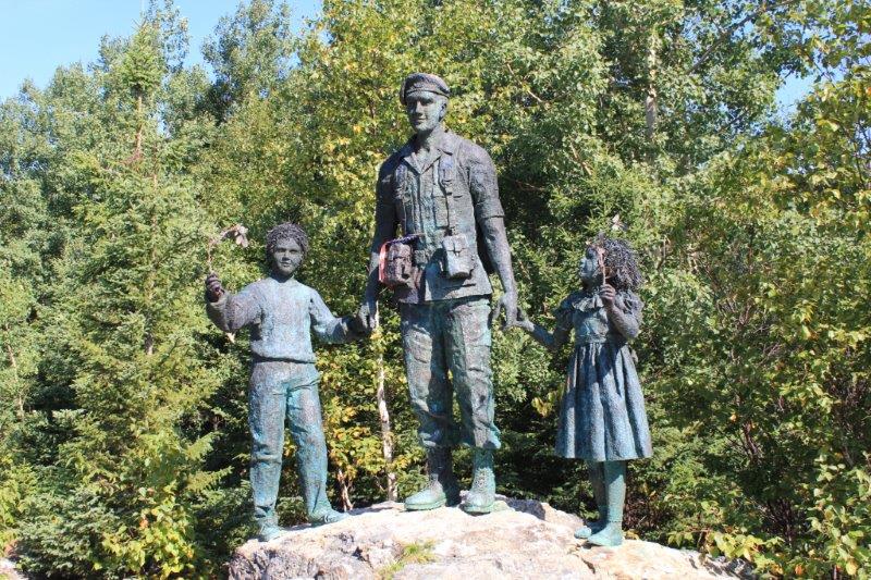 An unarmed soldier and two children holding olive branches. The statue was designed by a Newfoundland artist and made by a sculpture in Kentucky.
