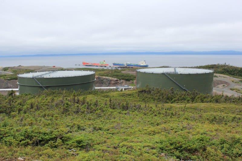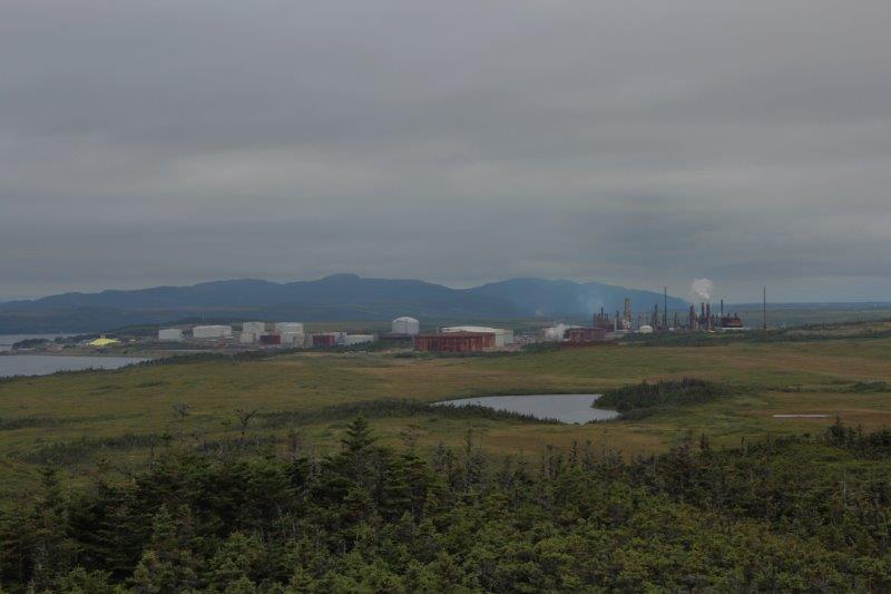 Our second lookout stop was at Arnold’s Cove. We didn’t hike here but Poppy had to do a 1/2 mile of off-roading. The view was over the Placentia Bay and on a clear day you could see many of the islands. But today it was pretty grey and hazy so the view wasn’t too good. The interesting part, especially for John, was the view of the oil refinery on one side and the six gigantic oil storage tanks and two oil tankers docked at the shore. John loves that industrial stuff – that and nice farm land are his two favorite views, I think.