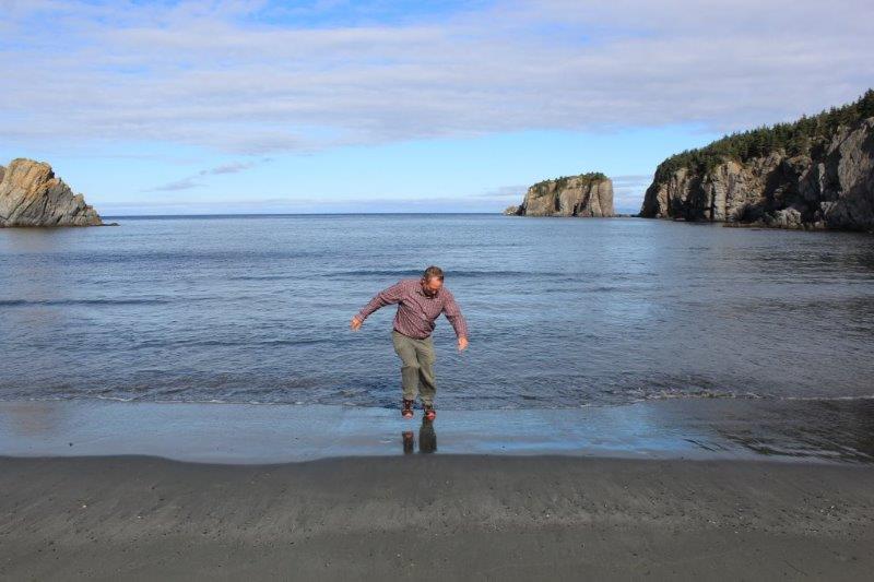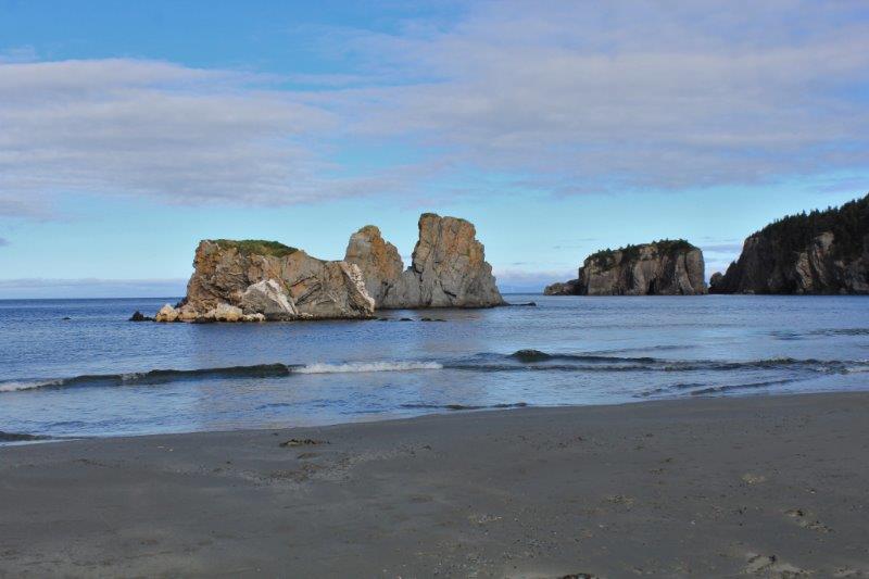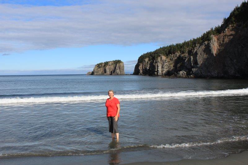 The last stop was at Salmon Cove to see the 500′ heart-shaped grey sand beach. By then there was a bit of blue sky and the steep cliffs and rocks in the bay made a lovely scene. I took off my hiking boots and socks and waded into the Atlantic. It was freezing but crystal clear.