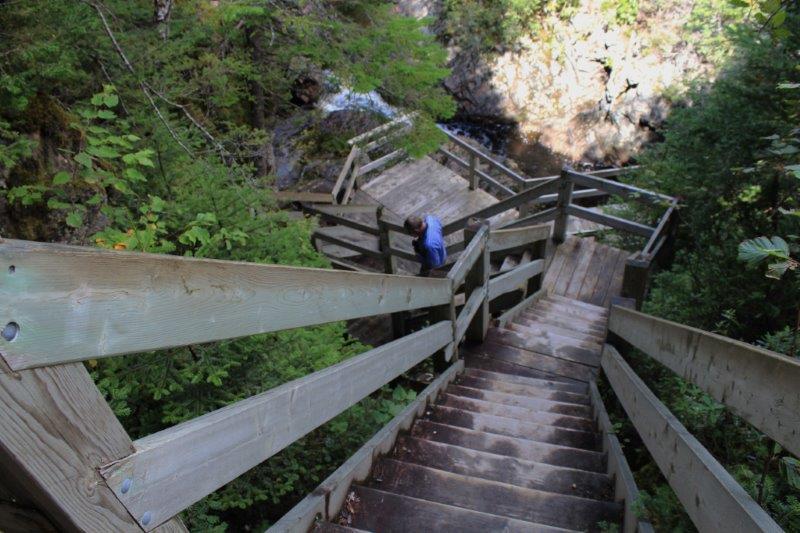 I noticed that on the ‘Welcome to Colinet’ sign there was a photo of a wide waterfall flowing under a bridge and sure enough right beside the road again was a path to steps to view the falls. We also walked across what was a previous road bridge over the middle of the falls to see it from that angle. There is a fish ladder there as well. That second falls tipped the scale in favor of the drive on the gravel being worth it. Not sure Poppy would agree though.