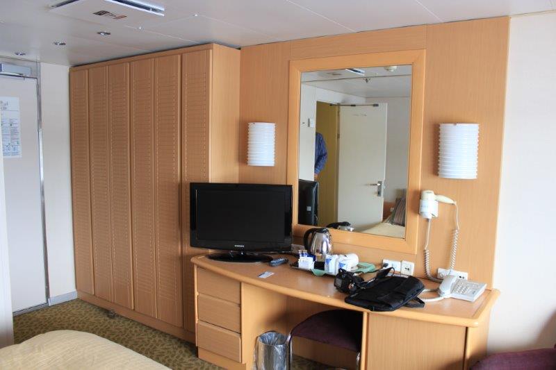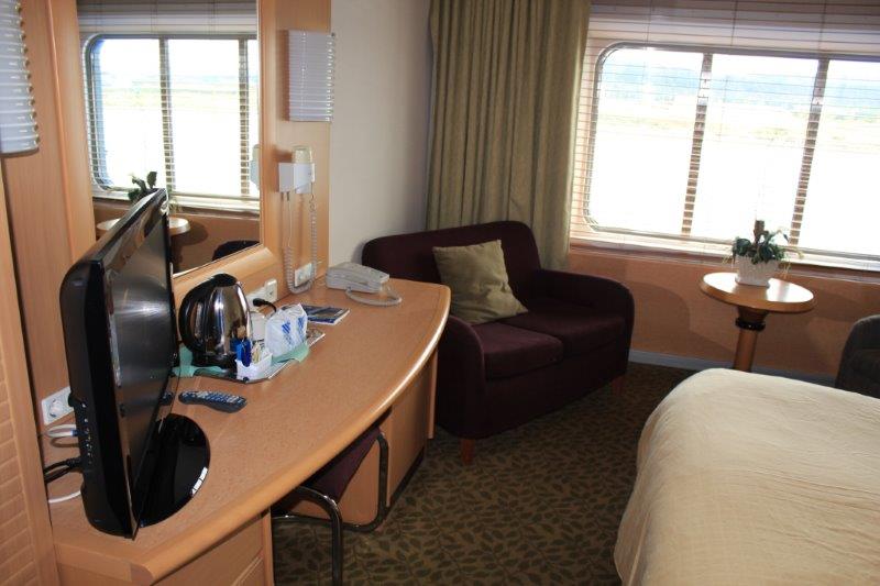 We climbed from car deck 3 to 5 then took the elevator to 10 where our cabin was located. There are only 6 guest cabins on this deck; all the rest of the cabins are for the crew. There are cabins on decks 6 (not too many), all of deck 8 and over ½ of deck 9 – a lot of these cabins have drop down berth beds. Our cabin was bigger than our deluxe veranda suite on the world cruise!