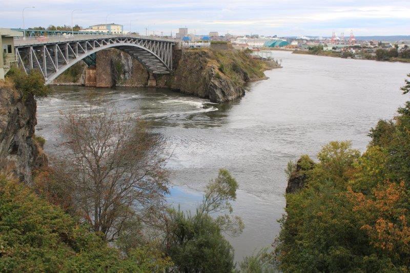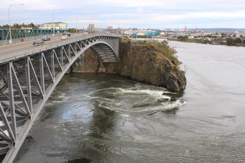 St. Martins is only about 40 km for St. John so after we returned from the end of the Trail we drove into town to find the Reversing Falls. Stella (our GPS) was programed with the Reversing Falls on Bridge Street. We tried locating by address and by attraction name and both times Stella led us to the wrong place. John asked a fellow how to get to the falls and we eventually arrived about 20 minutes before high tide. There is a restaurant at the visitors center there (on Bridge Road) and we watched the water while we had dinner. The amount of water and the speed that the tide flows into the St. John River is pretty amazing, but other than a lot of eddies and ripples there was nothing reversing that I could see. My info said high tide and low tide. We found out from our server that the water reverses at the ‘slack’ – mid-way between high tide and low, and low tide and high. So….tomorrow we need to catch a low tide and a slack tide to really appreciate the effect. We will be right at home too because the oberservation deck is on top of the restaurant so we can climb some more stairs!
