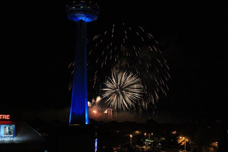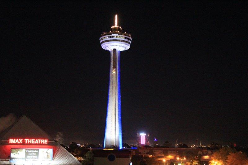 The windows in The Keg show a lovely view of the falls. With the cooler temperature as the sun went down there was a lot of mist but pretty cool nonetheless. Tomorrow we will take the incline rail tram down to the falls level and walk around and we also plan to ride the exterior car to the top of the Skylon Tower – 99 stories.