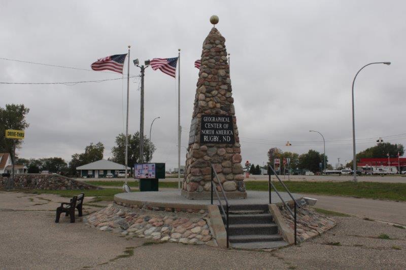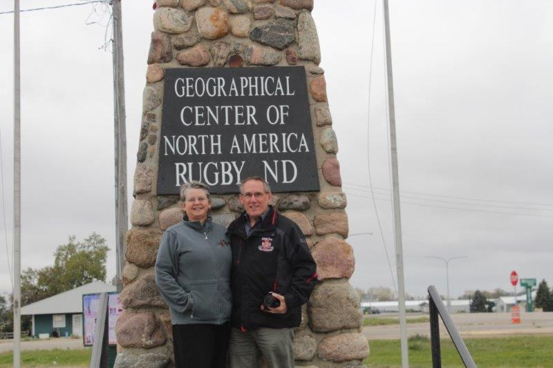 Before we left Rugby this morning we located the cairn marking the geographical center of North America just beside the highway on our way through town. I took John’s photo, he took mine and as we were walking back to the truck another couple got out of their truck and offered to take a photo of us both. Sweet – and I don’t like having my photo taken as a rule – but I was glad to get this one.