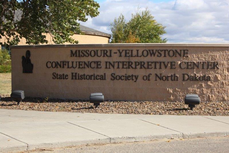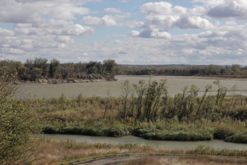 Williston is quite near the North Dakota-Montana border and we turned south there on Route 1804 to see if Fort Buford State Park and Fort Union National Park were still open. Just down the road for the turn to Fort Buford there is the Visitors Center for the Confluence of the Missouri and Yellowstone Rivers. We turned in and went through the large visitor’s center to the pathway along the riverbank. Up a short hill you could see over the young trees and just make out where the two rivers joined.