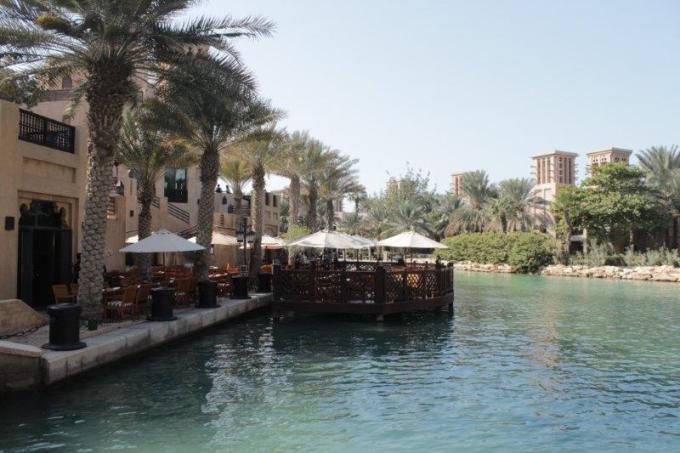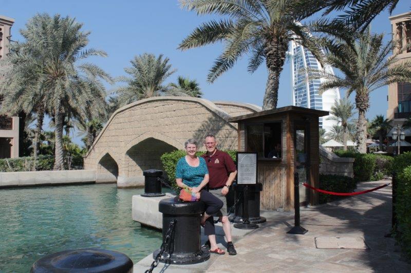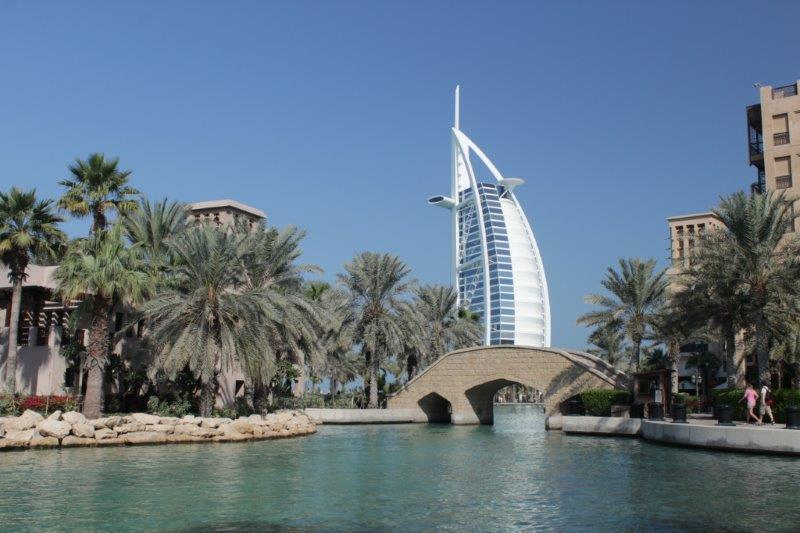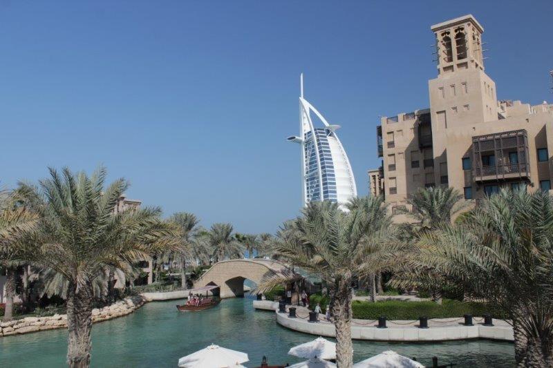 Once the majoirty of the crew was up, washed and fed we were off to explore. (Carrie didn’t come along – she was probably not wanting to venture into traffic again so soon after yesterday.) Joseph took us to Madinat Jumeriah where there is an indoor souk patterned after the world’s longest-running covered souk in Damascus. From the promenade at the river’s edge there are lovely views of the Burj al Arab; the world’s only seven star hotel which has become the iconic symbol of Dubai.