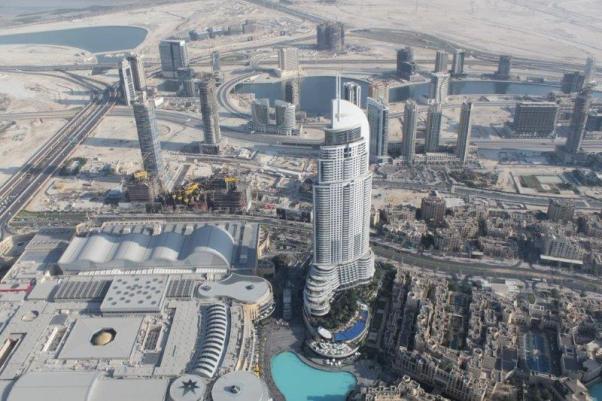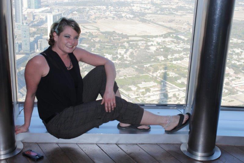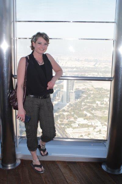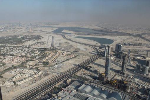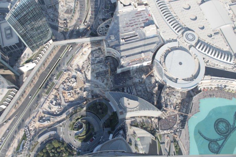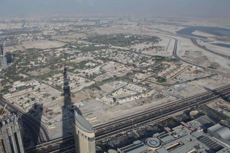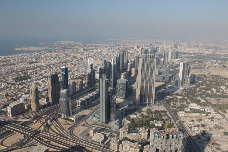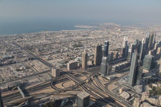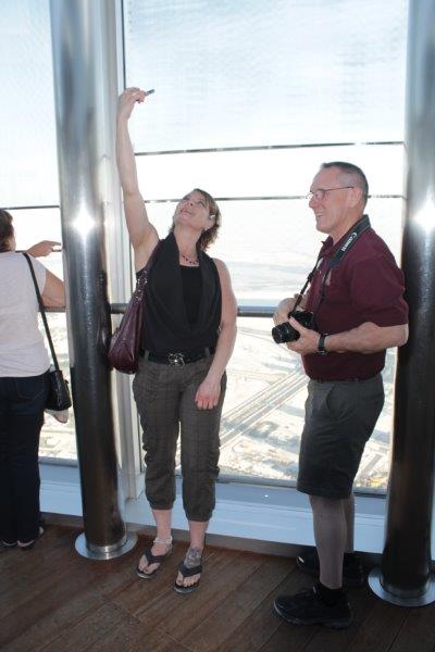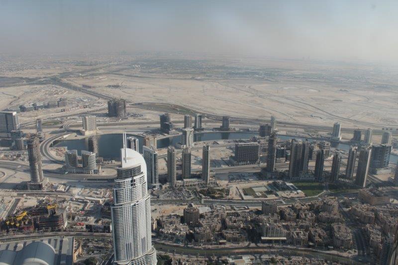 The main event of our touring today was “At The Top,” a ride to the 124th floor of Burj Khalifa – there are 163 in total. The Burj is 828 meters tall (2722 feet). The ascent and descent take 1 minute exactly. Now that is a FAST elevator; it makes yours ears pop. No glass windows. I am sure people would not like to see how fast we are moving. They regulate the number of people going up so there are not hundreds and hundreds milling around at a time. There is an enclosed platform that juts out from one of the sides of the building and an open slat at differing heights in each window so whether you are tall or small you can stick your hand out, or your camera if you are very careful to have the strap wrapped securely around your wrist. The endless view was incredible and it was surreal to realize that we were looking down on all of the tall buildings that stretch skyward from the ground. A really, really cool experience.