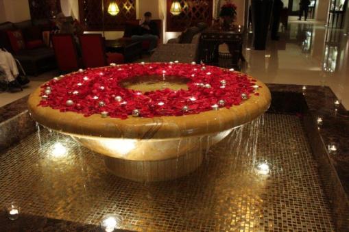 A fountain bowl of poinsetta petals