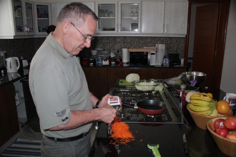 Carrie felt better after her relaxing morning, put the Christmas music on to play and made Coconut Cloud Cake for tomorrow evening’s dessert while I prepared the dry ingredients for the stuffing so I just need to add the liquids before putting it in the turkey tomorrow. John came in to help with the preparations and was put to work peeling and grating the carrots for the coleslaw and our carrot side dish. Trish had been doing laundry today but offered her assistance too. She did the slicing for our whiskey/brown sugar carrots. Even the brussel sprouts were prepped, so we are all set for tomorrow.