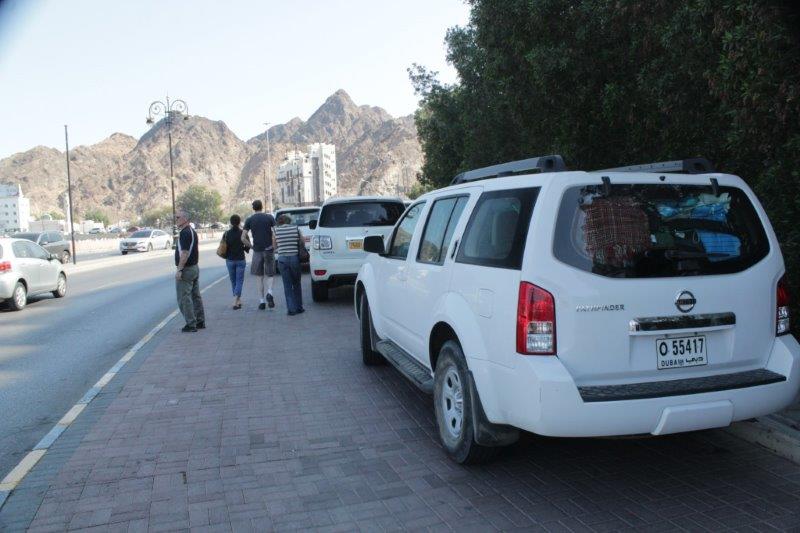 Parking in Muscat is always a challenge. The lots in the malls fill very quickly as do any spots on the streets so drivers make parking spots out of any space they can find. If they own a four-wheel drive vehicle it is very common to see them drive over curbs and across meridians to park on sidewalks or an open space. Any empty alleyway becomes a parking lot.