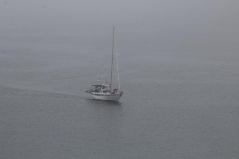 CAM00317 CAM00318 CAM00320IMG_6387John and I had hoped to find at least one geocache during our stop here but the nearest one showing on the GPS was almost half a kilometer back through town and when we got to the site it had a second set of co-ordinates to follow which would have taken us even further away from the pier.  The last tender left the dock at 2:30 and it was getting close to 2 o’clock by then so we walked back and caught a tender back to the ship.  The fog was still so thick we were almost upon the ship before it was visible; one moment there was a solid white wall and the next there was a ghostly-looking ship skulking out of the mist.