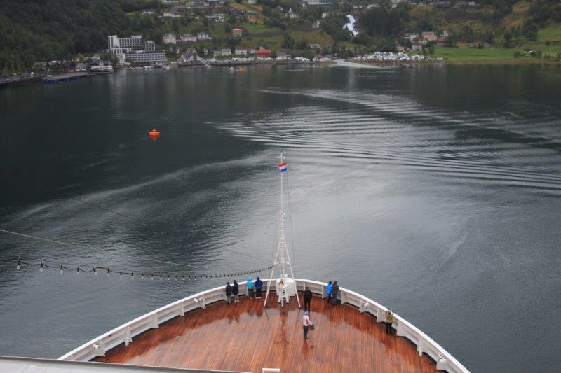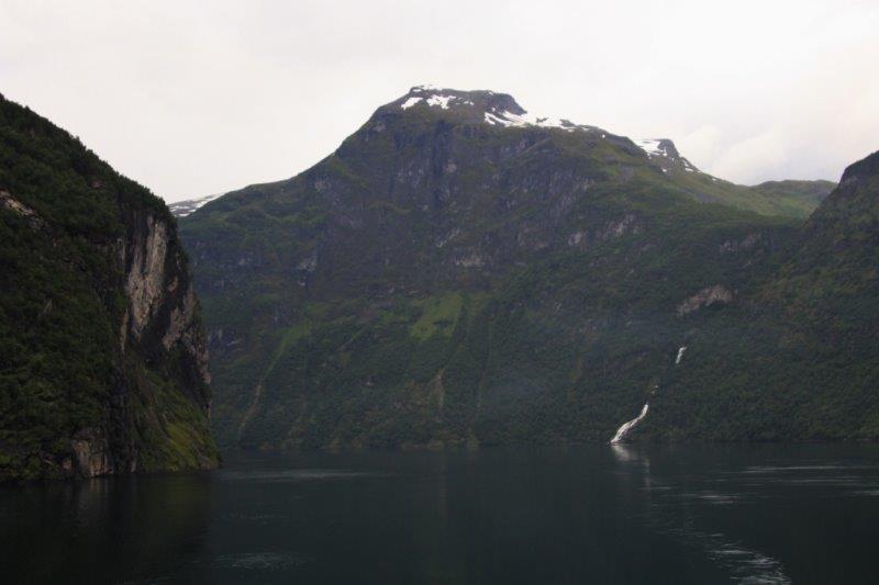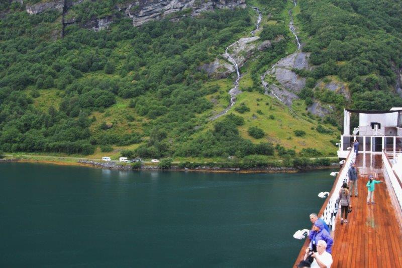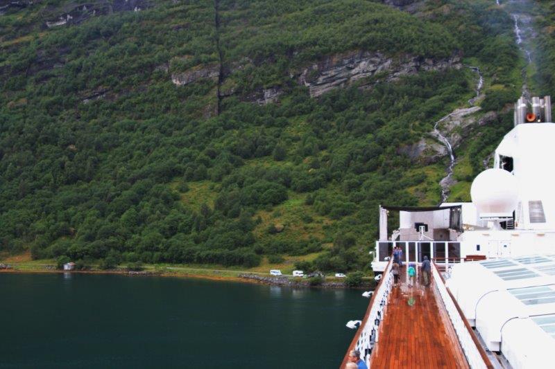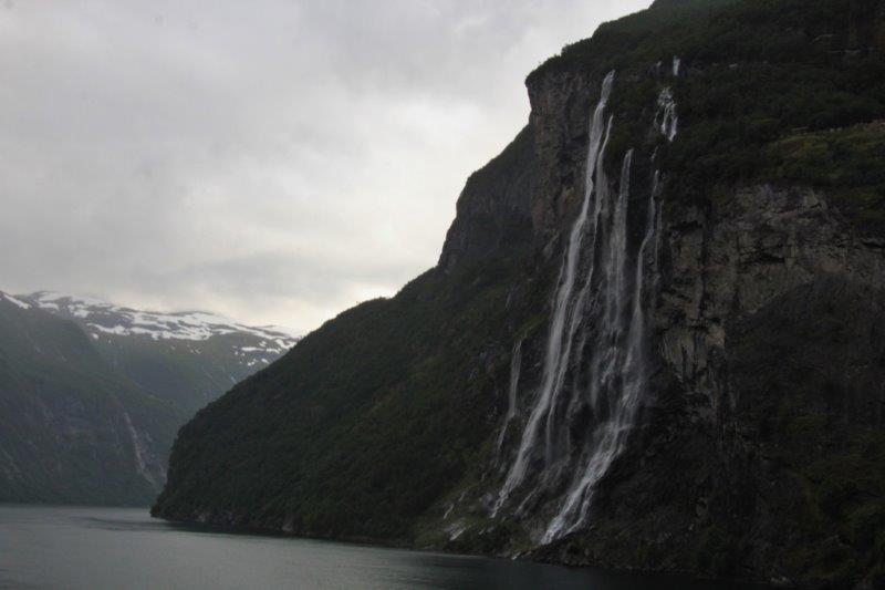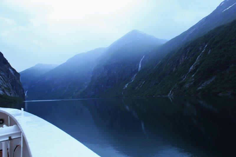 We have completed three consecutive stops in Norway.  We sailed along the Geirangerfjord in the early morning hours.  John and I got up a little after 7 and went out onto the bow.  The sky was overcast so the steep mountains on either side of the ship were grey and misty.  Still, it was nice with dozens of waterfalls dropping hundreds of feet into the fjord.