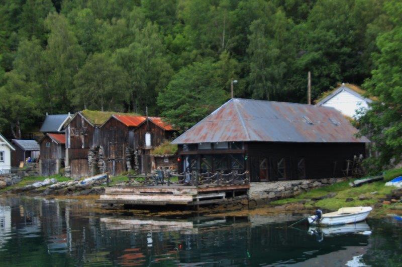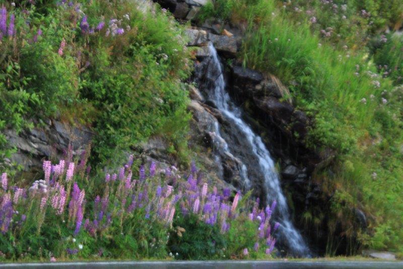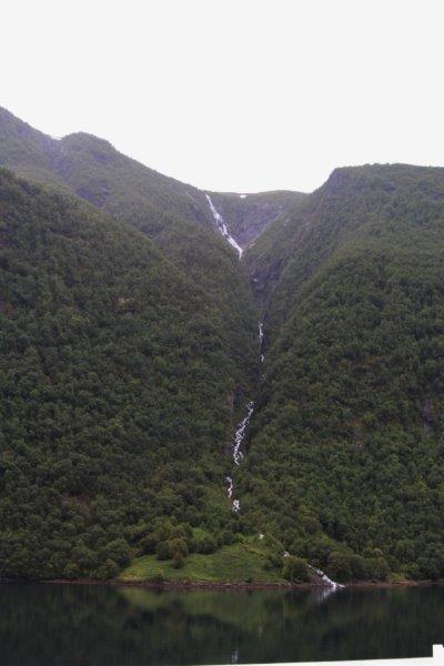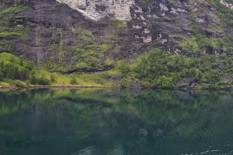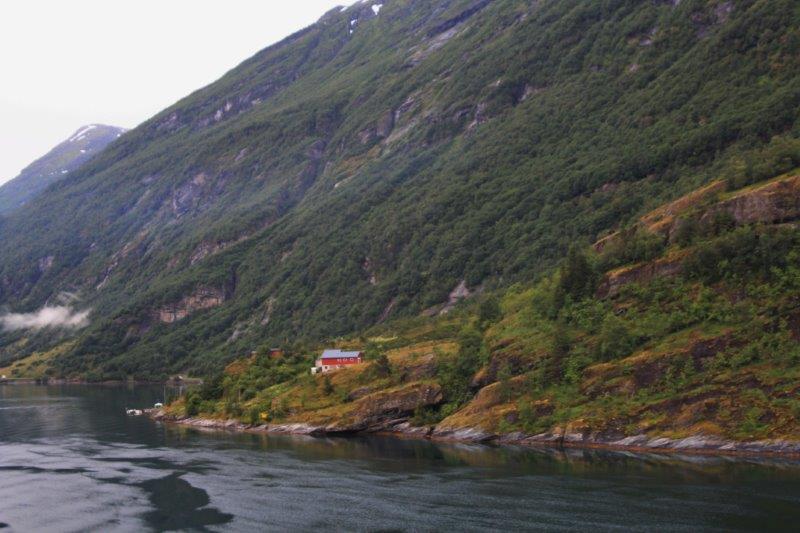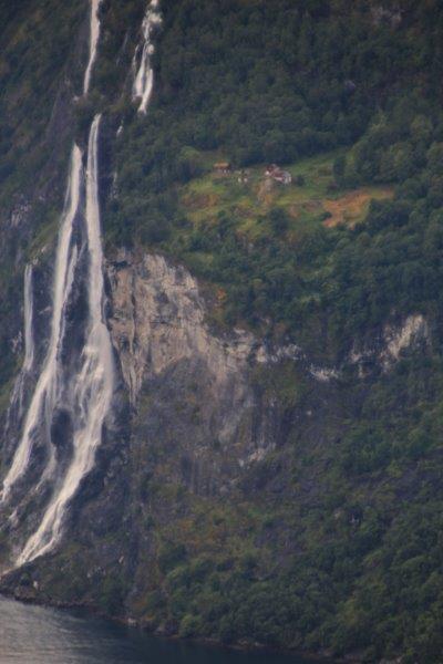 There are several abandoned farms scattered around the area.  Mostly, they raised sheep and goats. Only 2.7% of Norway is arable land and only .7% is in permanent crops.  Sheep and goats are the only domestic animals that can navigate the steep slopes.  One such of these farms was located on a relatively flat parcel of land near the Seven Sisters.  But it was so high up the cliff face that it took hours to carry any supplies up or down to the fjord and was completely inaccessible in winter. The mother of the family used to tie a rope around each of her children’s waists when they went outside to play so they would be safe from falling off the cliff into the fjord. When education became compulsory for children in the 1950’s the farm was abandoned.  With my zoom lens I was able to get a shot of it – not a very clear one but it gives you an idea of where they lived.