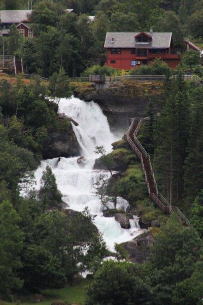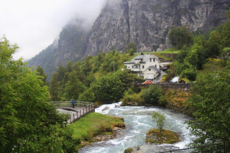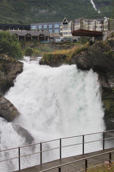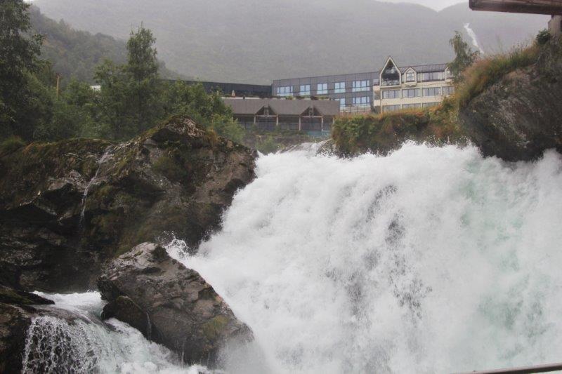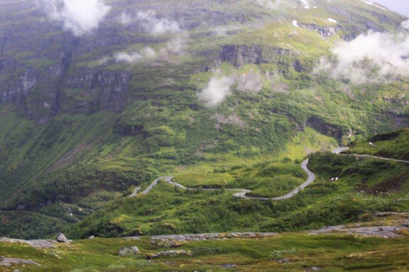 The day continued to be cloudy and misty but visibility was still good.  Norway has been experiencing a very cool and wet summer this year.  Our bus driver very capably negotiated the switchbacks up the Eagle Road to the view point.  All the passengers got off the bus and it continued to the top where it could turn around and pick us up for the drive down.  From the viewpoint you could see the entire end of the fjord and look back the other way to view the Seven Sisters waterfall – of which only Four Sisters were flowing as it is late in the summer and most of the spring melt has finished so Three of the Sisters have stopped.