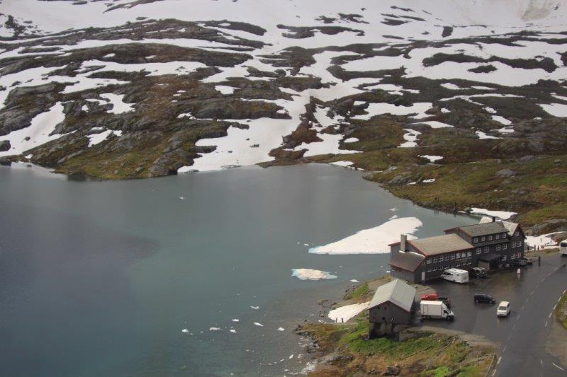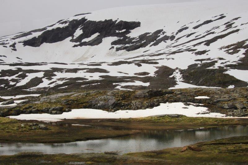 IMG_8185 IMG_8187After we navigated the hairpins back down we drove through Geiranger and up the steep road on the way to the top of Mt. Dalnibba, which is above the treeline at 5000’ above sea level.  We reached Big Lake and turned off the road onto a private toll road to reach the mountain top.  We were literally two corners from the top and the fog rolled in. By the time we got parked and out of the bus you could see nothing. Even the little lake behind the visitor’s center that I glimpsed as we drove in was obscured.  Very disappointing – but there is nothing you can do about the weather.  Barb and Bob took the same tour at the same time but they were on an even numbered bus that went to Mt. Dalnibba first and she got some lovely photos.  She sent me a couple that even had a rainbow from edge to edge.  This is what we didn’t see.