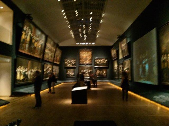 We actually saw two different exhibits this year, the Napoleon one from Russia and a portrait exhibit of leaders of the Dutch Guilds who took care of all trade and the security in the city during The Golden Age of the late 17th century.  These paintings are unique in the world and are rarely seen due to their enormous size. It was permissible to take photos without flash in the portrait gallery but we didn’t have our cameras.  I took one quick photo with my phone; which isn’t very good but will give an idea of how big these paintings are.  Only the wealthy could afford to have their portraits taken so these works clearly show the leaders of commerce and trade.