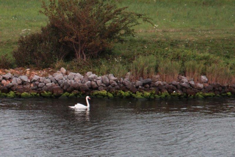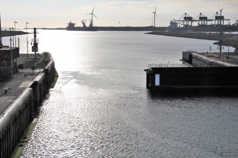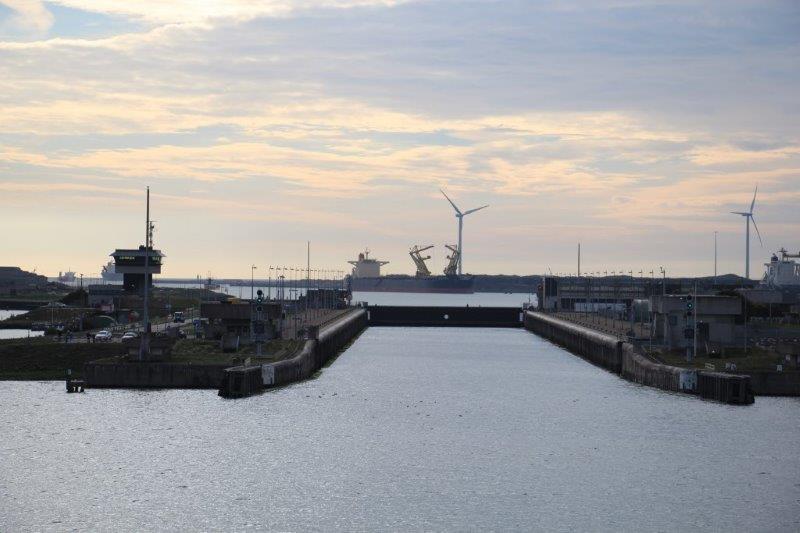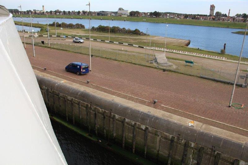 While we were eating dinner we sailed the long channel out of Amsterdam.  We went to the cabin, got our cameras and went onto the bow deck to watch the sail through the lock taking us out to sea again.  The captain had announced that he expected to be in the lock at 7 pm and at 6:59 were tied inside waiting for the gate to open to lower the water level back to the sea.  (Amsterdam sits 18’ below sea level.)  Tomorrow we are in Belgium, the port city of Zeebrugge (Zee-rouge with a B sound at the beginning) and are taking my most-wanted tour of this trip – “Ypres, In Flanders Fields.”