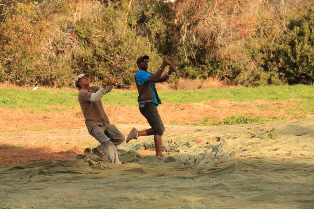 A big fan blows air into the balloon once it is stretched out on the tarps.