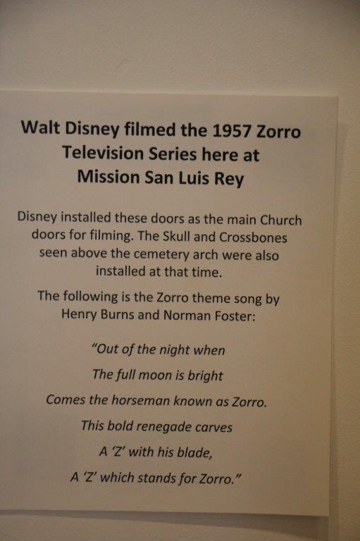 The Missson probably featured prominently in American history class and I am sure it was also mentioned in many books and movies but in the last room of the museum there were two painted wooden doors attached to the wall and above them was a poster promoting the 1957 Disney-produced television series “Zorro.” Disney used the Mission for a regular set in the series; the helpful Friar Felipe was a member of the Franciscan Monks who lived and worked at Mission San Luis Rey. The Disney studio used the doors for the TV series and they also put a skull and crossbones above the entrance to the cemetery, which is still there today. I loved Zorro – well I really loved his black horse, but he was good too. Childhood memories Chapter 2!