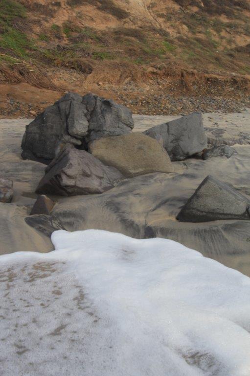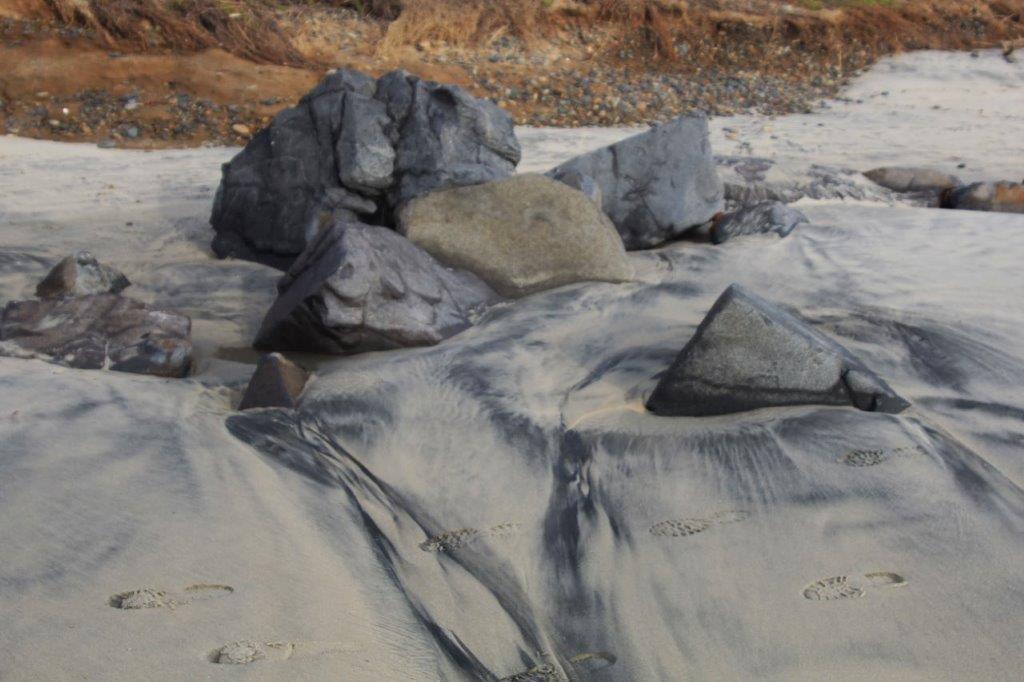 This clump of black rocks had steaks of black on the sand deposited by the incoming waves.