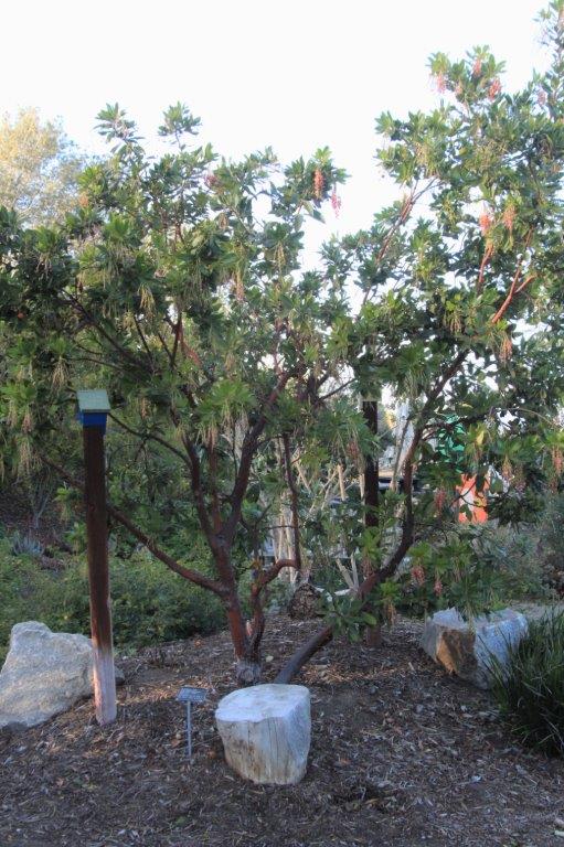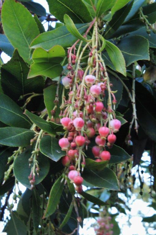 This is called a strawberry tree, obviously for the blossoms. Hummingbirds really like the nectar in them.