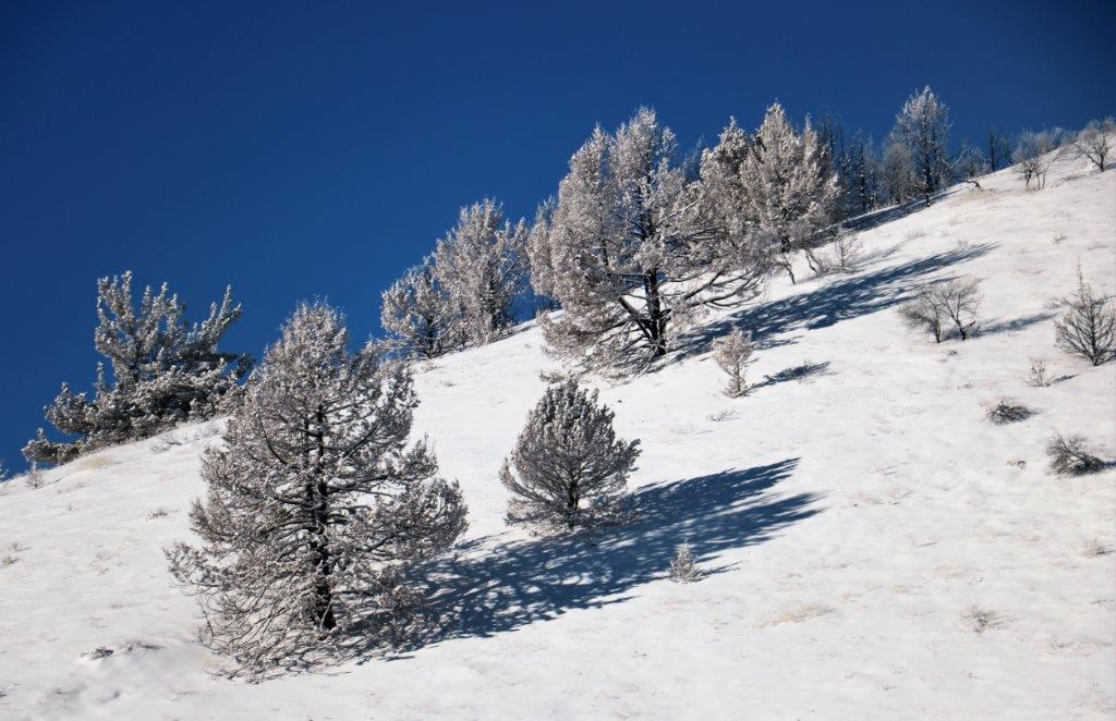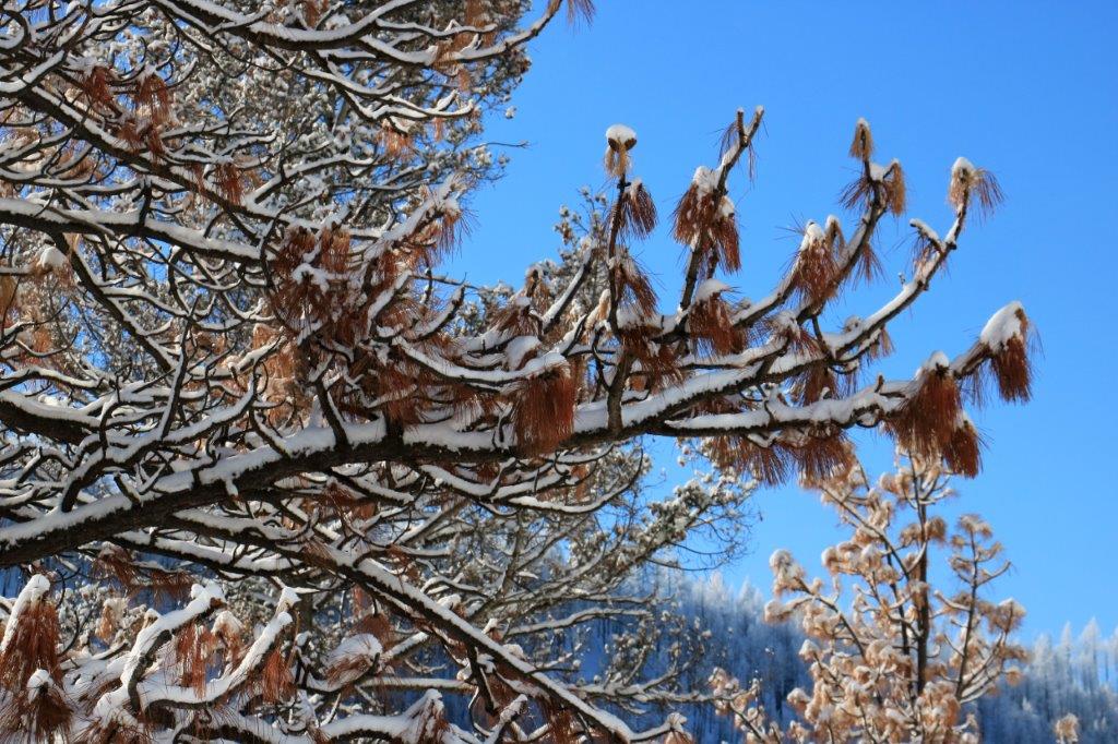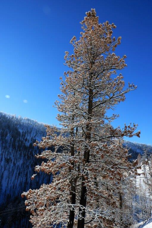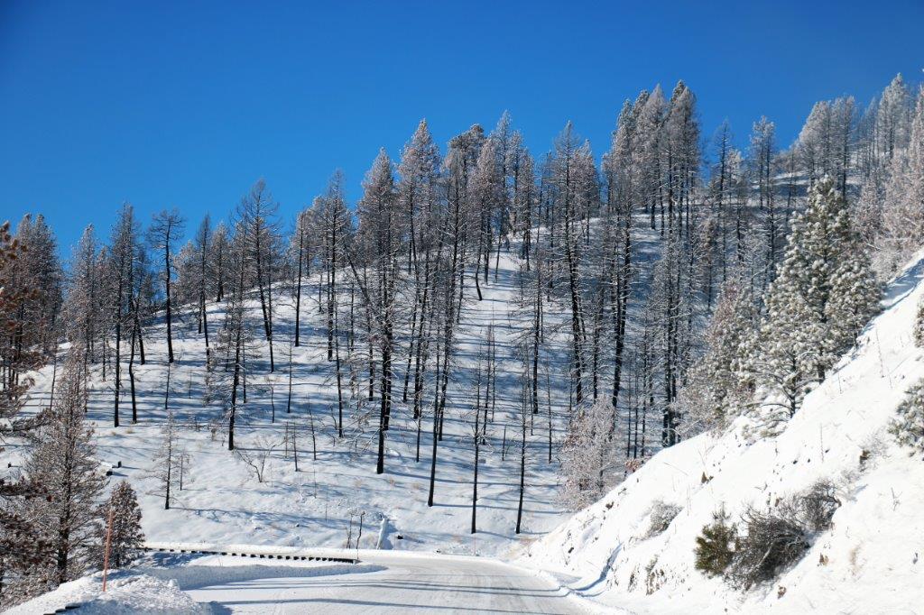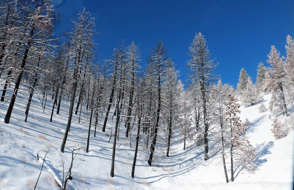 A few years ago the area was ravaged by a forest fire. The contrast of the blackened trees against the white snow and blue sky was very pretty.