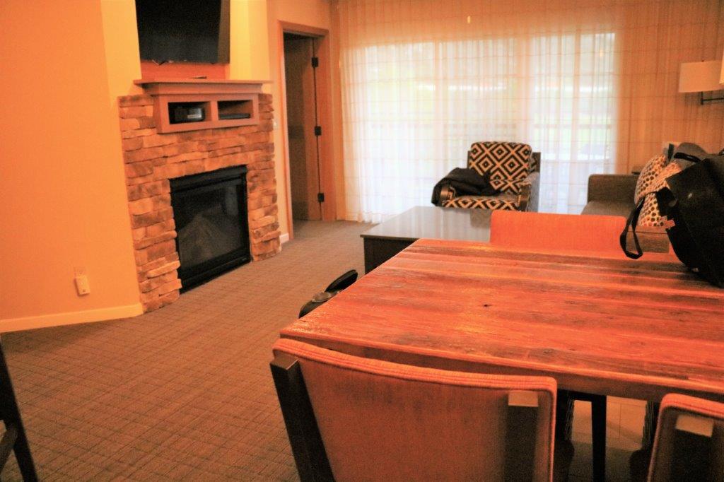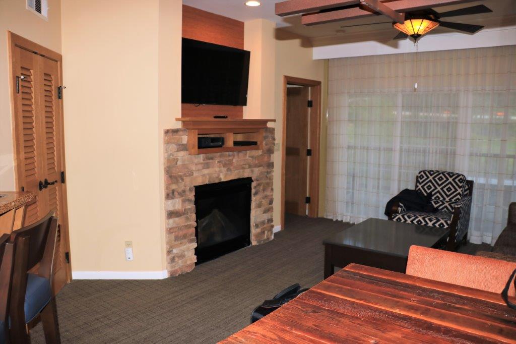 We have been to the Lawrence Welk Resort before. Last time our unit was down by the shops and the golf course. This time we are up on the hillside. We did a loop walk around the resort almost every day we were here before and walked past these buildings. The unit is very nice. We are on the top floor so have a nice view over the resort below. It is a very nice one-bedroom place – we have two fireplaces; one in the living/dining area and one in the bedroom. The kitchen has more cupboards than any condo we have stayed in before. Usually we are shifting dishes and pots into stacks so we have somewhere to put our food. Here, we have a pantry cupboard and lots of storage spaces in the kitchen, bathroom and bedroom.