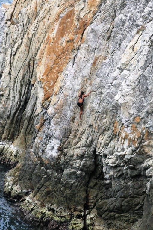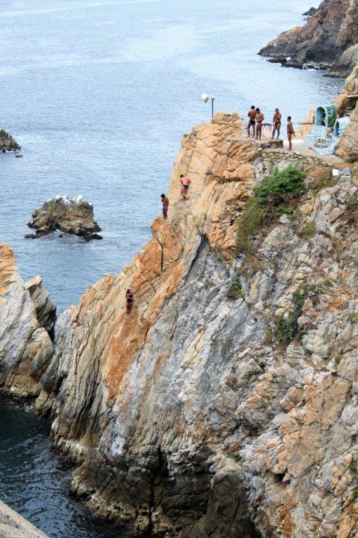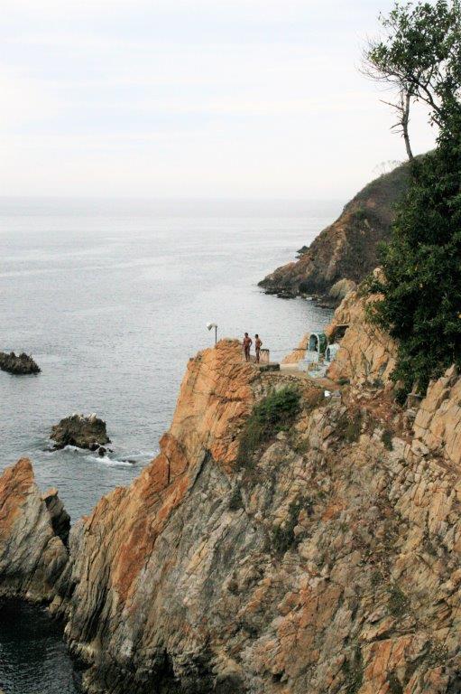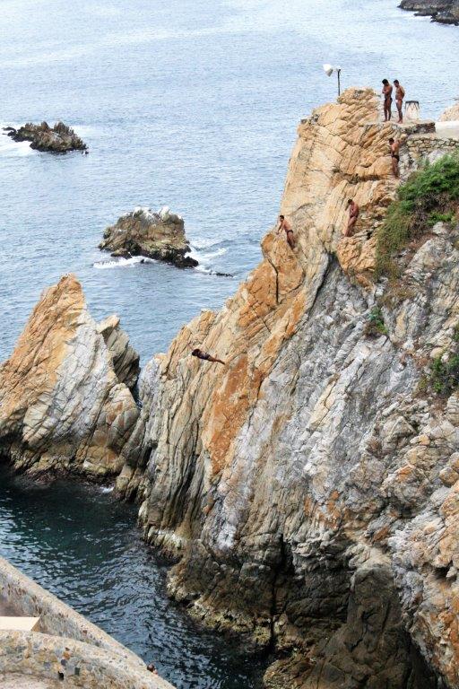 The view from the hotel terrace across from the jagged cliffs of La Quebrada allows an unimpeded view of the divers. These brave young people plunge 134 feet into a narrow strip of roiling sea between the cliffs. There are three levels up the cliff face that they launch off – the less experienced from the lowest level and the ‘pros’ from the top. Sometimes they dive two at a time from two different levels.