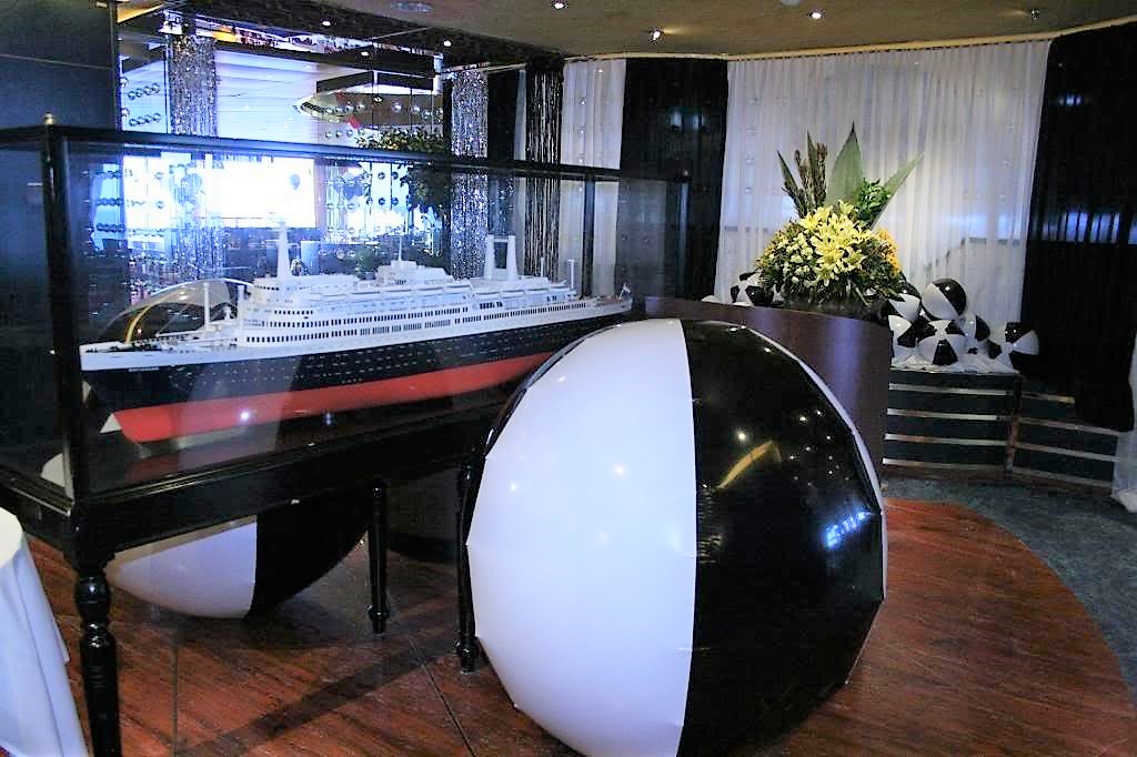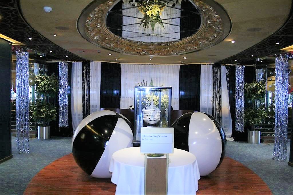 Two things broke up the long sea days. The first was the second formal night of the cruise, and the first themed-night: The Black and White Ball. We learned to like formal nights. Often there was a color theme or costume theme (you were under no obligation to take part) and every formal night we returned to our cabin to find a gift on our beds. We had previously received leather-bound journals stamped with the map of the world, and this night we were each given a multi-time-zone clock