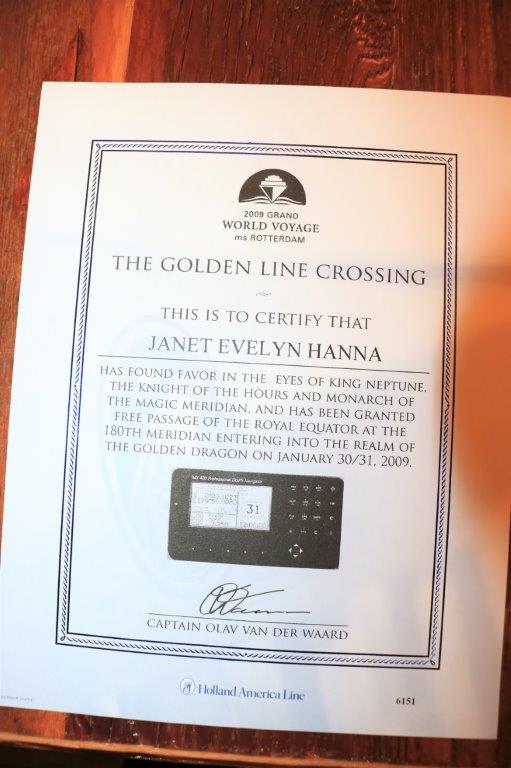 Second was the Golden Line Crossing on January 30. We crossed the equator at the International Date Line at noon so the date changed immediately to January 31. There is a tradition when making the Golden Line Crossing. The Captain blows the ship’s horn from the moment the bow touches the intersection of the equator and the International Date line until the stern has crossed over. We received certificates from King Neptune as you must have his permission to make the crossing.