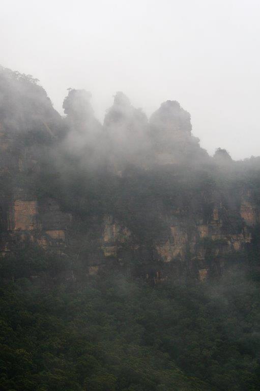 There is an aboriginal story about a man with three lovely daughters who were constantly being sought after by men he felt were not good enough for them. In order to protect them from making a bad match he turned them all into stone. The Three Sisters is the name of three upthrusting formations atop the mountain. The fog cloud parted just enough and just long enough to get a misty photo.