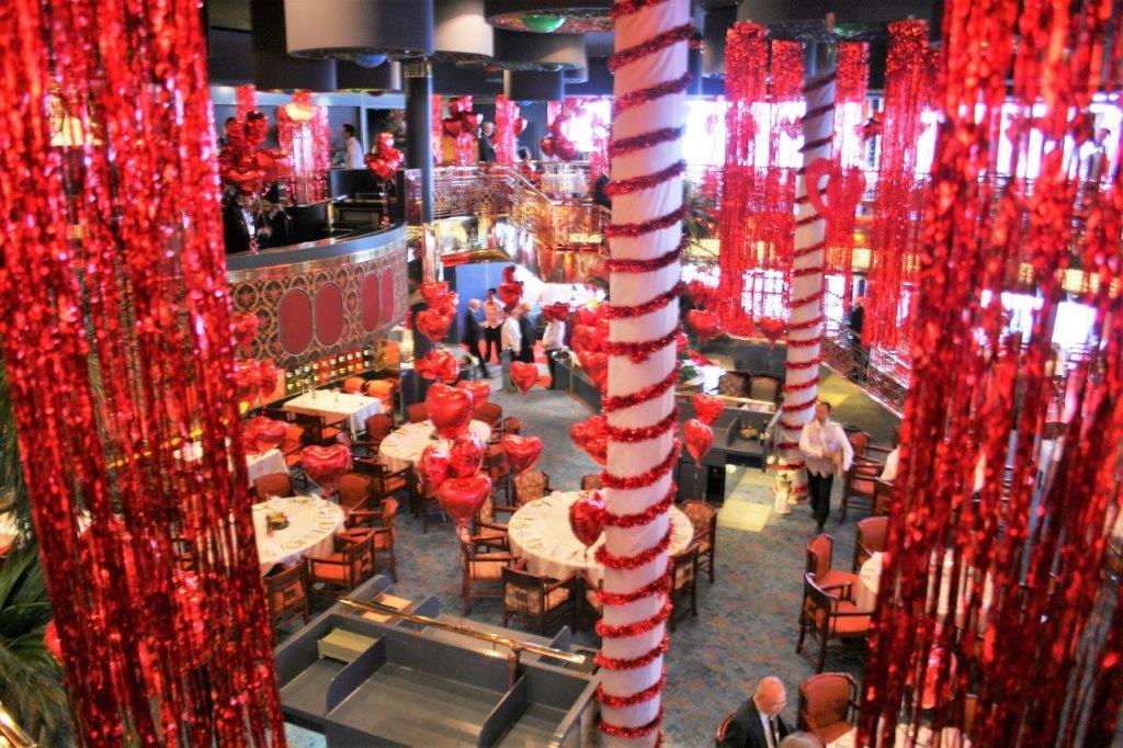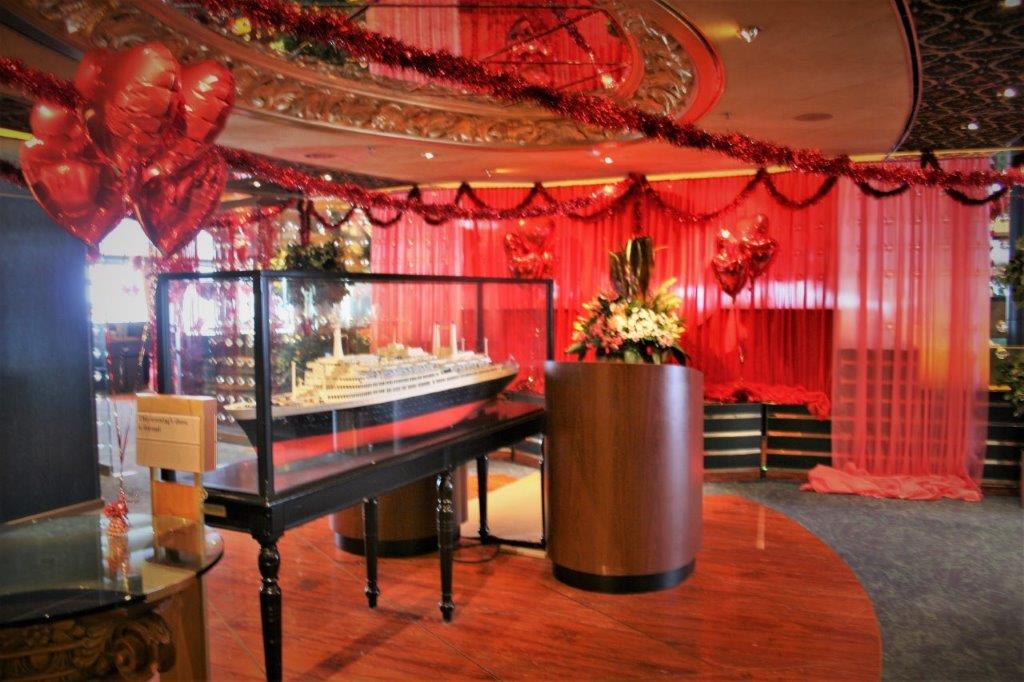 Our day at sea was Valentine’s Day; another formal night. As usual all the main lounges and the dining room and Pinnacle Grill restaurant were beautifully decorated. (Komang, one of the Assistant Dining Room Managers is in charge of all the decorating. He orders everything he needs and he and a few of the wait staff put it all up and take it all down.)