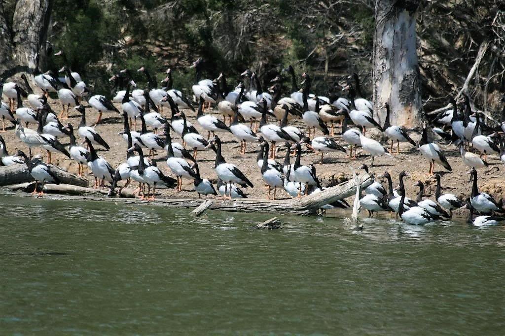 The tour group visited a billabong (water hole) and saw an emu, black swans and a large flock of Magpie Geese.