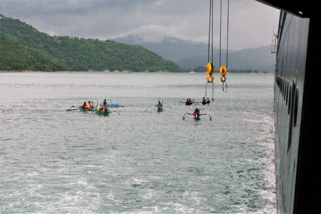 As the ship was preparing to set sail boats loaded with families or young children pulled up alongside hoping to have coins thrown down to them. This is a practice that is discouraged by the cruise lines as people can get injured, but some folks did it anyway.