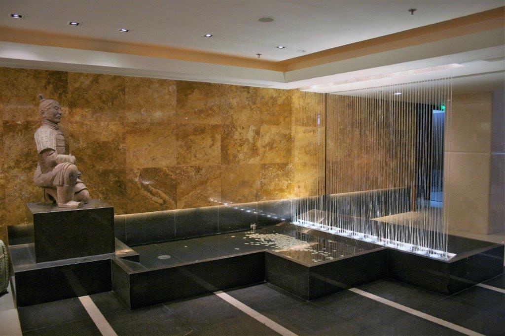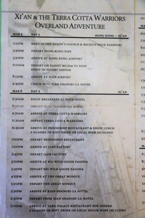 The 6 pm flight from Hong Kong to X’ian was about 2 1/2 hours long and we were fed a nice meal on the way. Once we landed we had almost an hour drive to the Shangri-la Hotel; a new – one year old – 5-star hotel. We had a beautiful room with complimentary shampoo, conditioner and soap, as usual; also razor, toothbrush, toothpaste, and slippers.