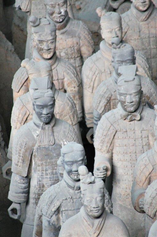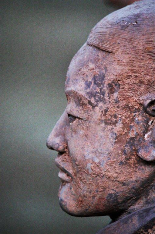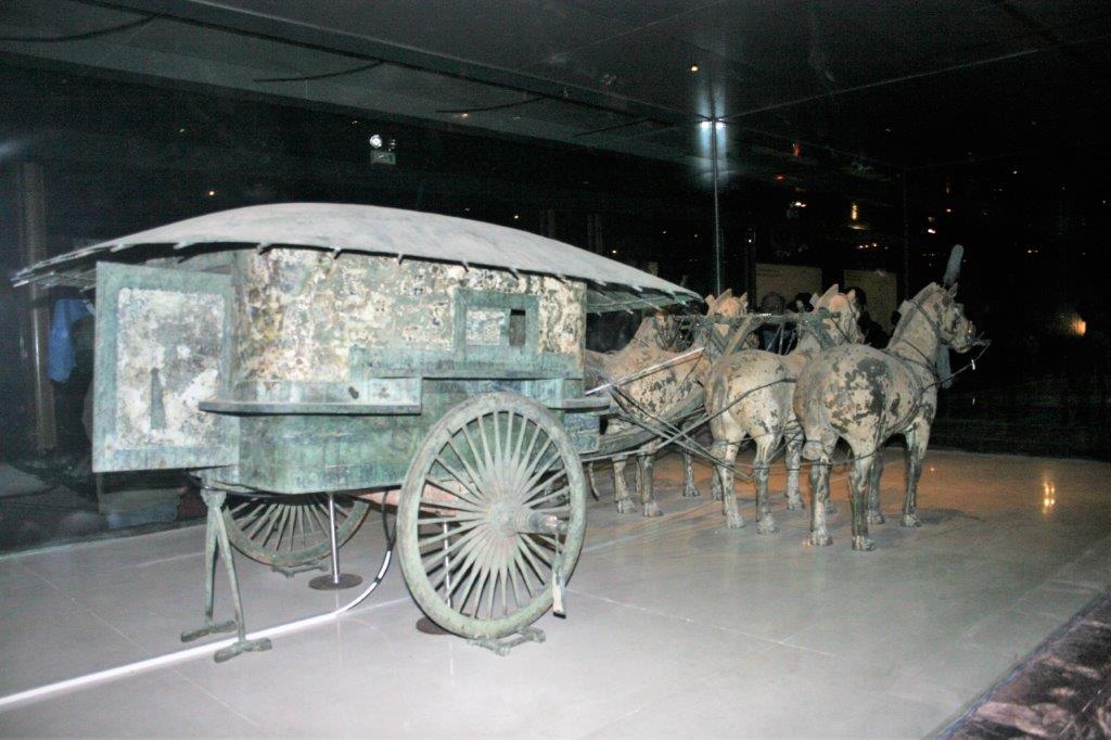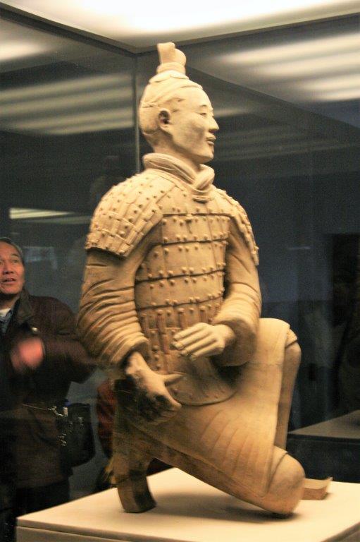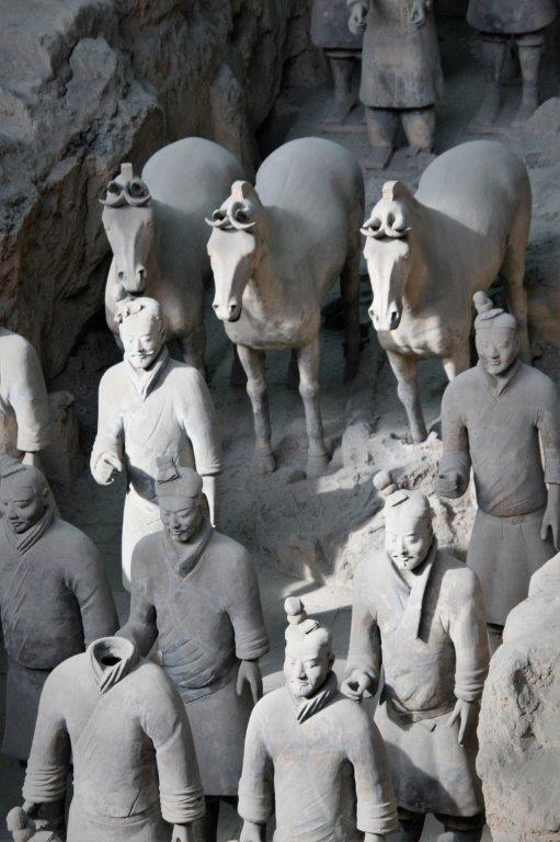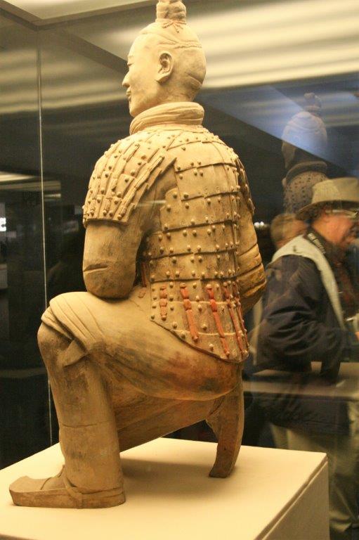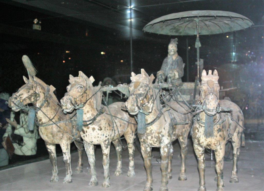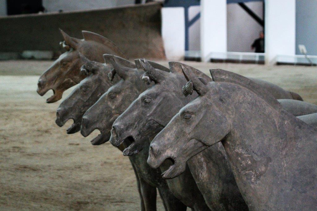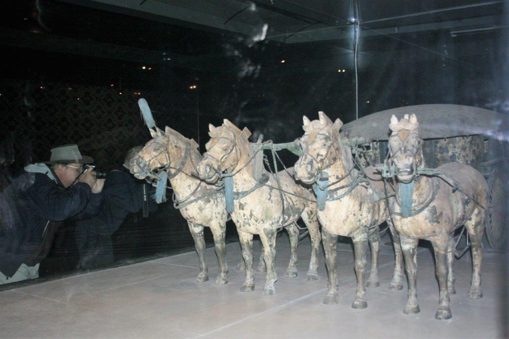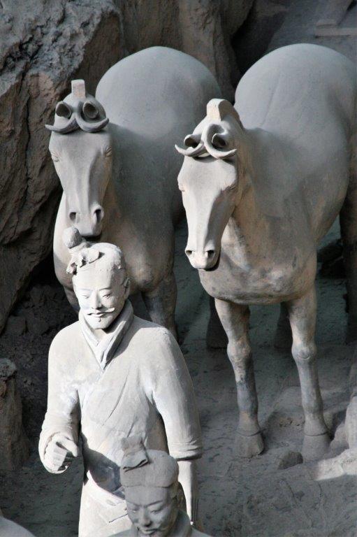 It is estimated that there are 8,000 soldiers, 130 chariots with 520 horses, 150 cavalry horses. The majority of which are still buried. Two half-size bronze chariots have also been unearthed and were on display in the Pit #1 building. Other pits contain figures of officials, acrobats, musicians and strongmen. I guess the emperor planned to conduct business and also wanted to enjoy some entertainment.