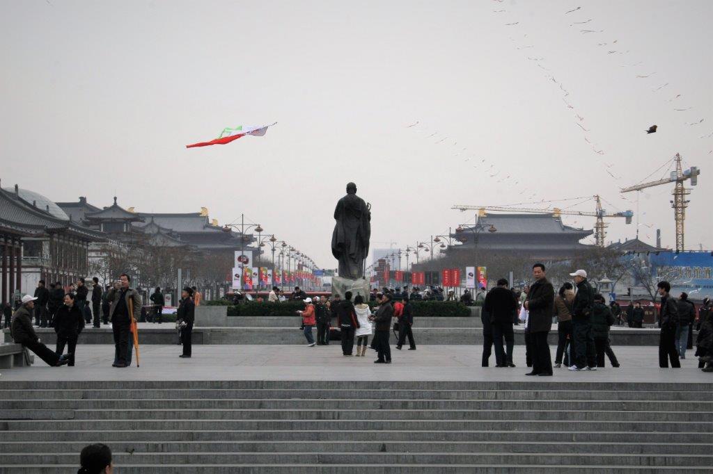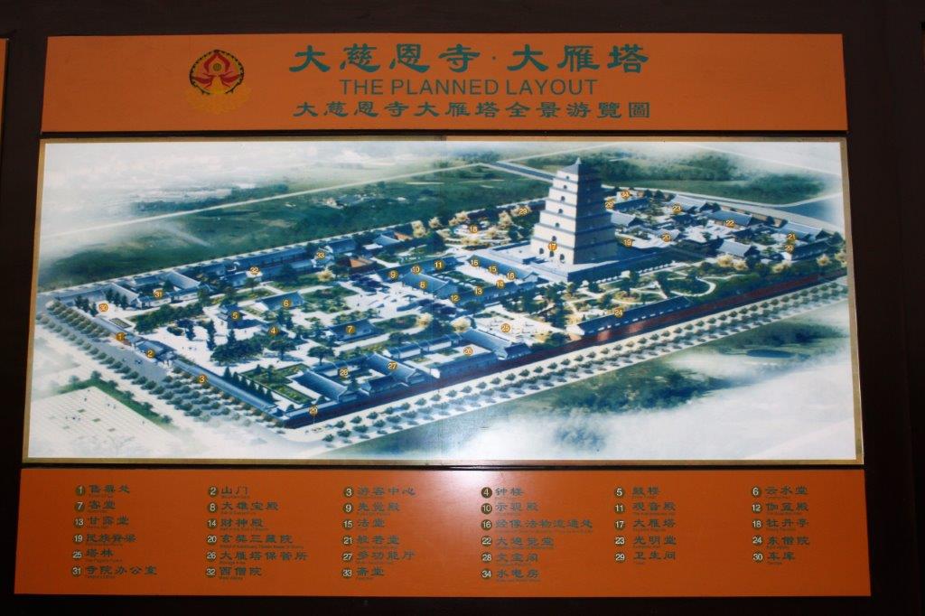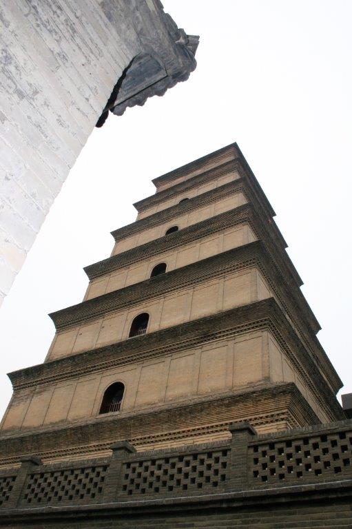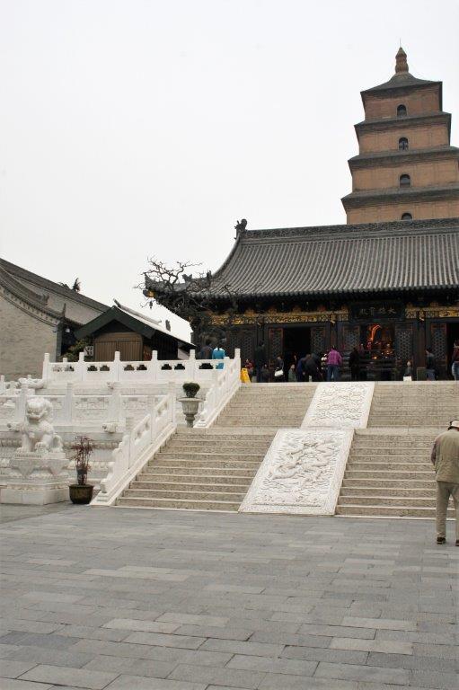After our shopping time we went to the Big Wild Goose Pagoda temple that was built in 652 AD to house the Buddhist scriptures brought back from India by a traveling monk. The original three-story structure collapsed 50 years later and was rebuilt five stories high. An additional five stories were added in 701-704. An earthquake in 1556 reduced it by three stories to the 7 levels it is today. It is the central building of a large complex that is still in use. There are 13 yards and 1897 rooms. It was the most famous temple in the city during the Tang Dynasty and is a protected historical site.