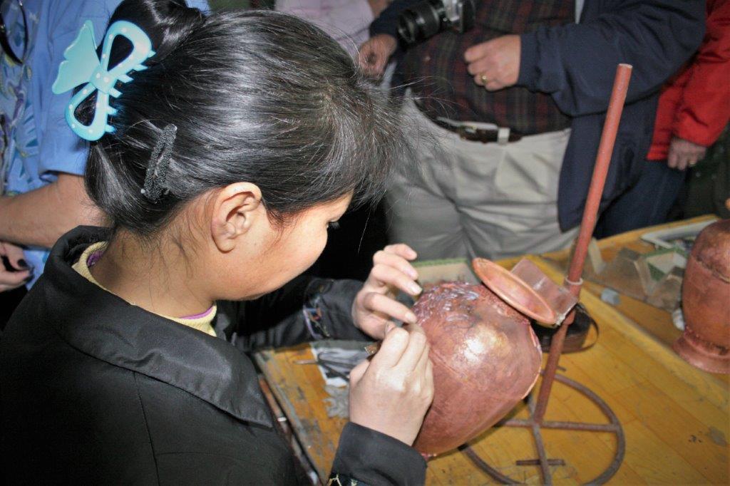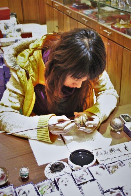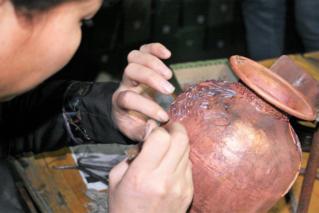 After lunch we visited a Cloissené factory where enamel paint is applied to a copper wire outlined pattern that has been soldered onto hand-hammered copper vases, plates, bowls, etc. This is then fired in a kiln, another coat of paint is applied; it is fired again. This process is repeated up to 6-7 times because the enamel paint shrinks minutely when heated and needs to be re-applied so as to fully fill the outline. When it is satisfactory the item is polished to a smooth sheen.