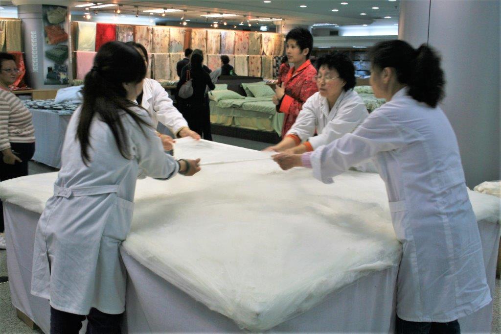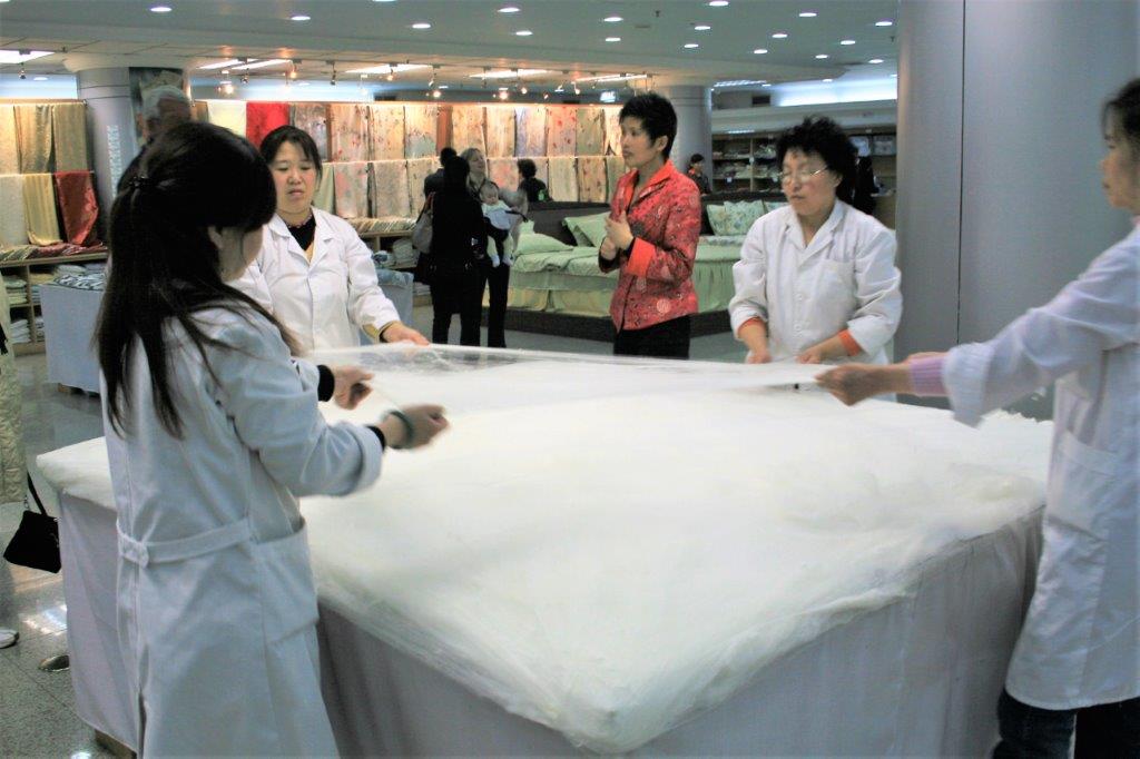 We got back on the bus, and, since we had made good time going through the Imperial City, our local guide Arthur arranged a trip to a silk factory where we saw ladies pull a ball-size lump of silk to make layers for a duvet. There are about 80 layers of silk in each one. They had beautiful duvets, covers, sheets, clothing, and yard goods. All of the silk patterns and fabrics are made at the factory.
