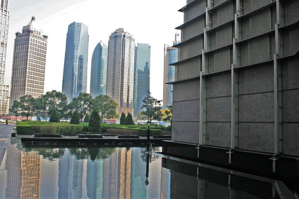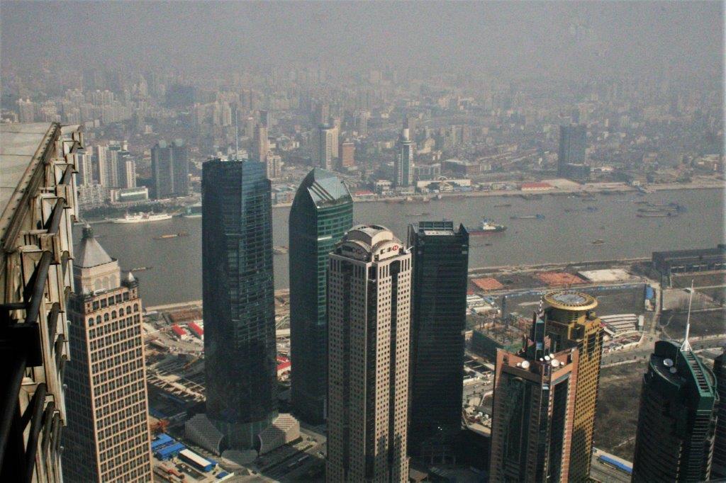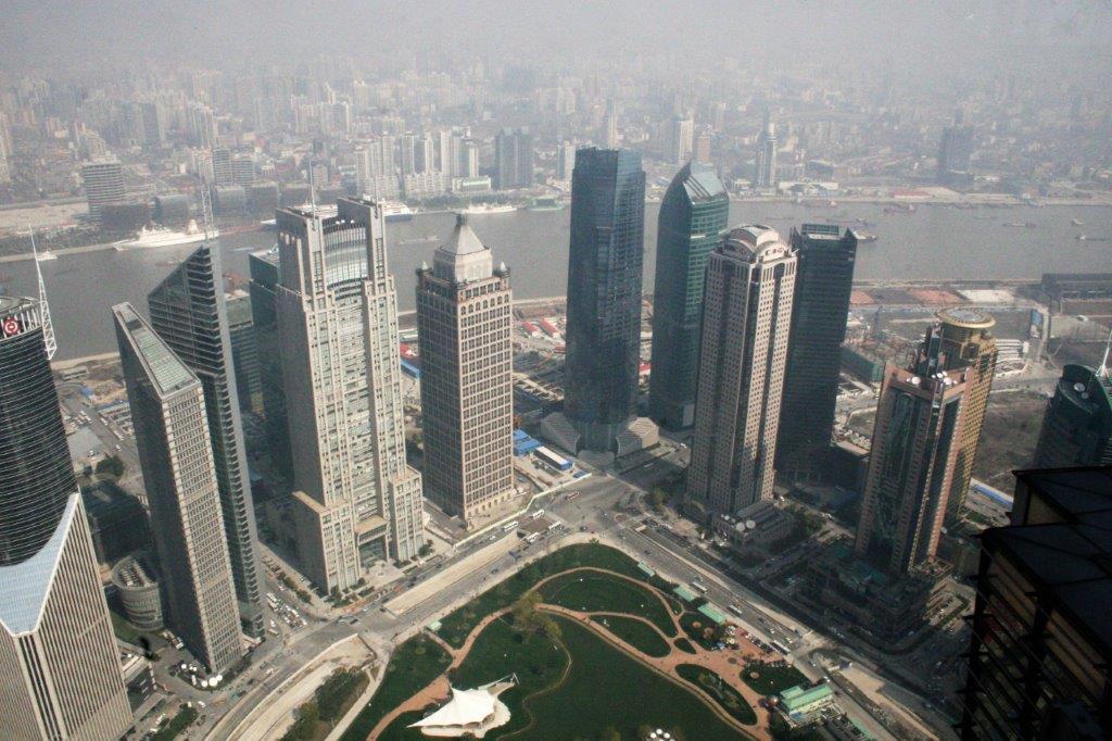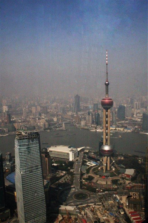 The first stop was the Jin Mao Tower, an office tower and hotel. It has an open circular center and we went up to the 88th floor and looked right down the middle of the building to the hotel reception. Cool.