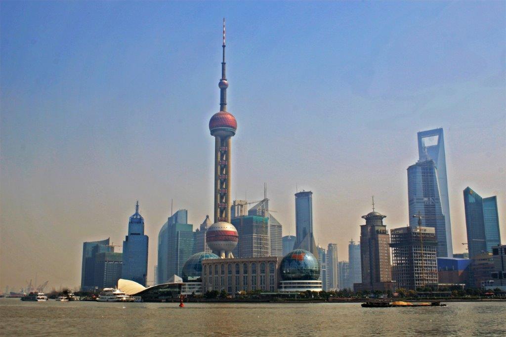 This the Oriental Pearl TV tower. It sits near the harbour shore and can be seen from all over the place.