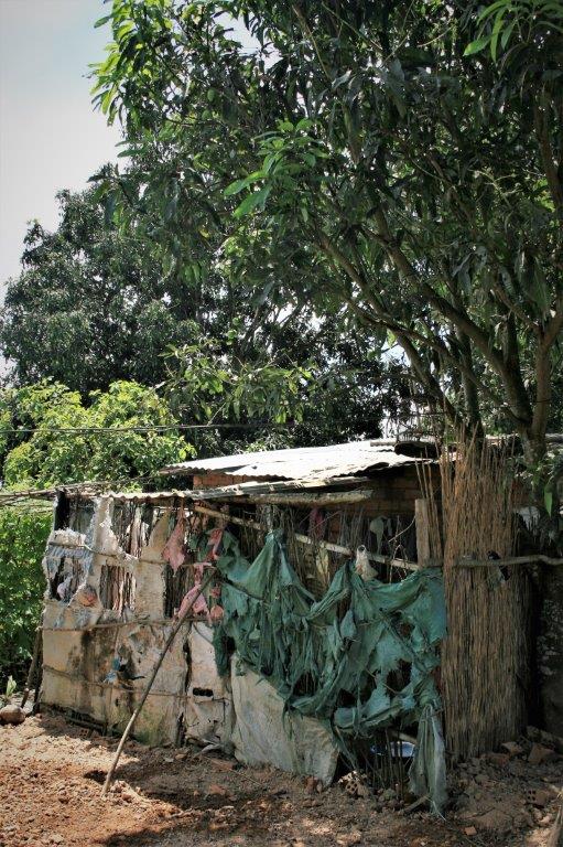 The kitchen had a packed dirt floor, rough wood walls and a tin roof. The walls and roof were full of holes. I have no idea what she would do in the wet season. There was a cupboard with a lot of blackened pots. No sink, no stove, no fridge, no storage. The bedroom was a patchwork of different size beds placed end to end and edge to edge.