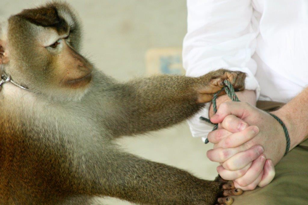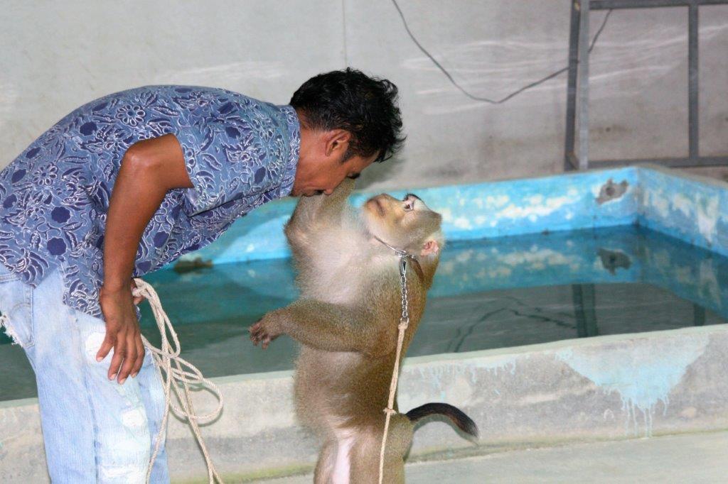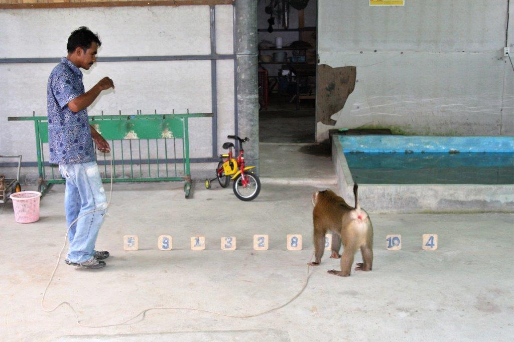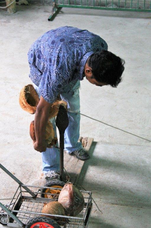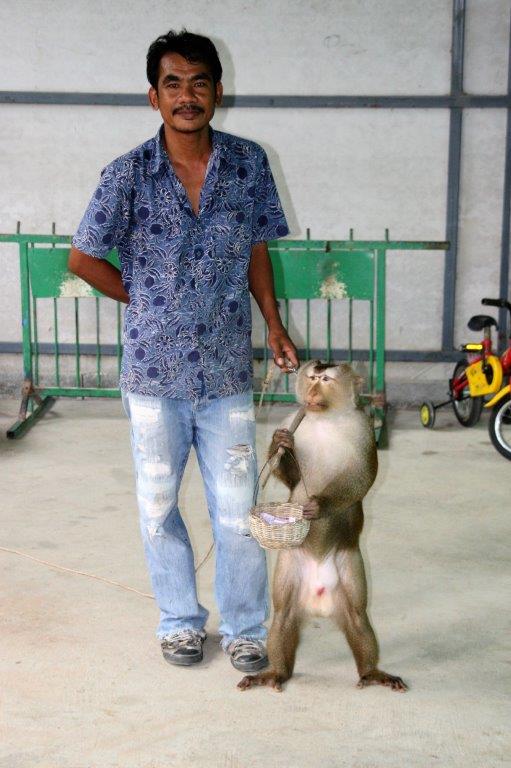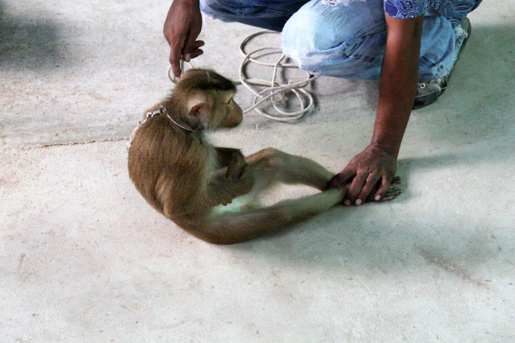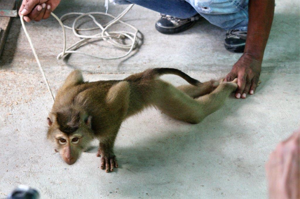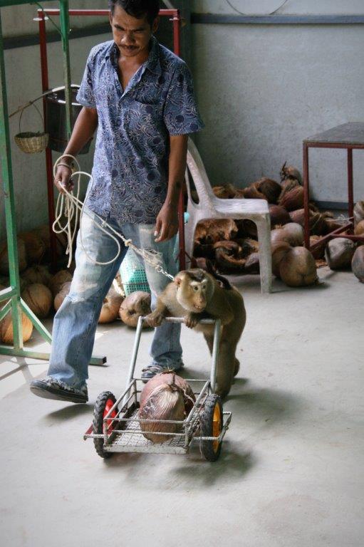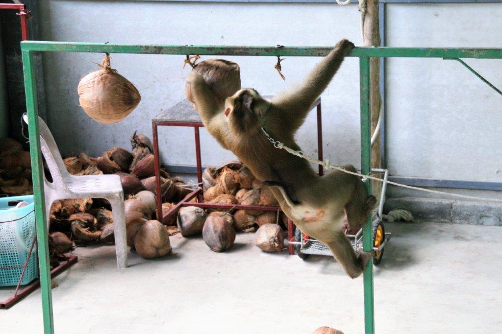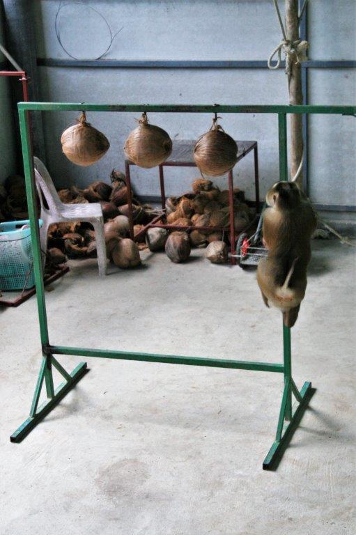 The monkeys (males only) are trained to climb the palms and twist off the coconuts so they fall to the ground to be picked up.