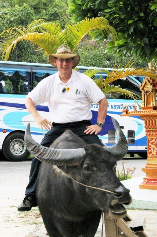 While we waited for our turn to ride the elephants John sat on this big water buffalo.