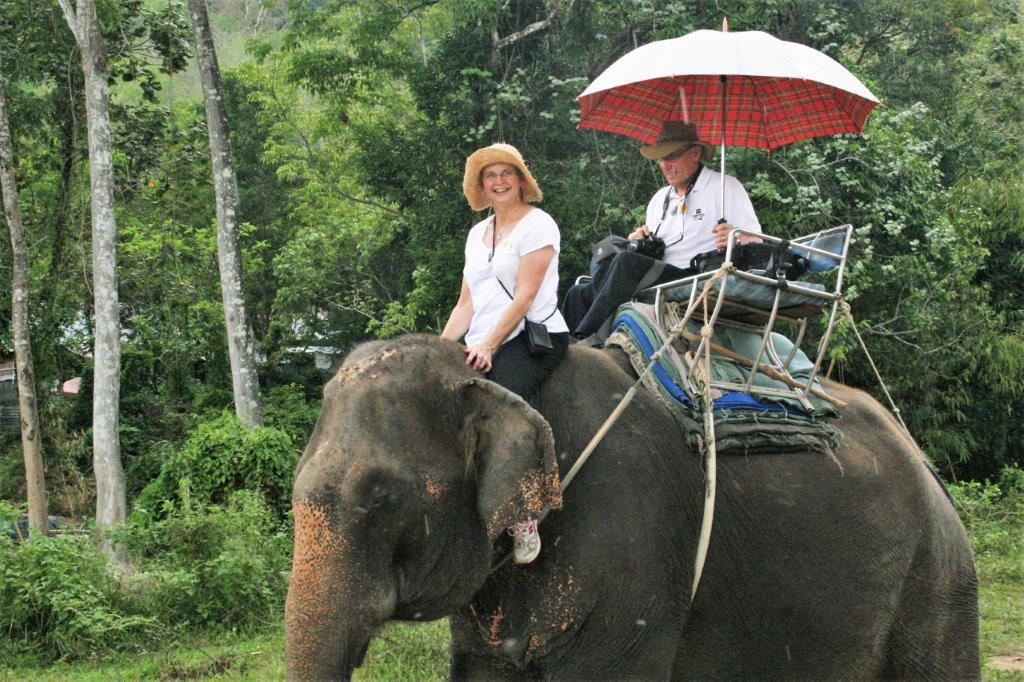 It wasn’t long after we set off that the rain began and umbrellas were handed round. When we had gone about half way on our 30-minute ride on the rugged up and down trail our guide stopped the elephant, hopped down and asked for my camera so he could take some photos for us. Then he asked me if I wanted get off the bench and sit on the neck while we walked on further. Well, yes, of course I did!