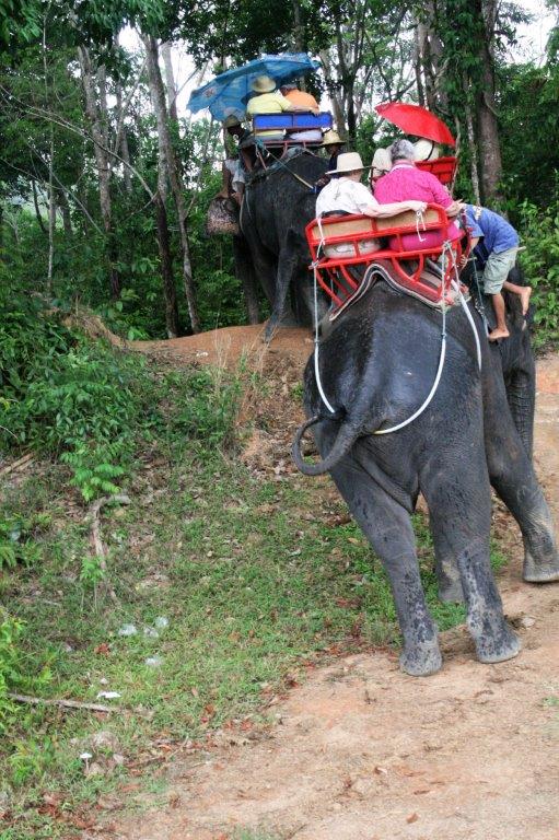 We climbed a platform and stepped off onto a bench on the back of an elephant; two persons per bench. Then a group of seven elephants (there were 14 altogether so we were in a rotation) took off to do the walk through the jungle. There were four buses of tourists at the safari so the elephants had a busy day.